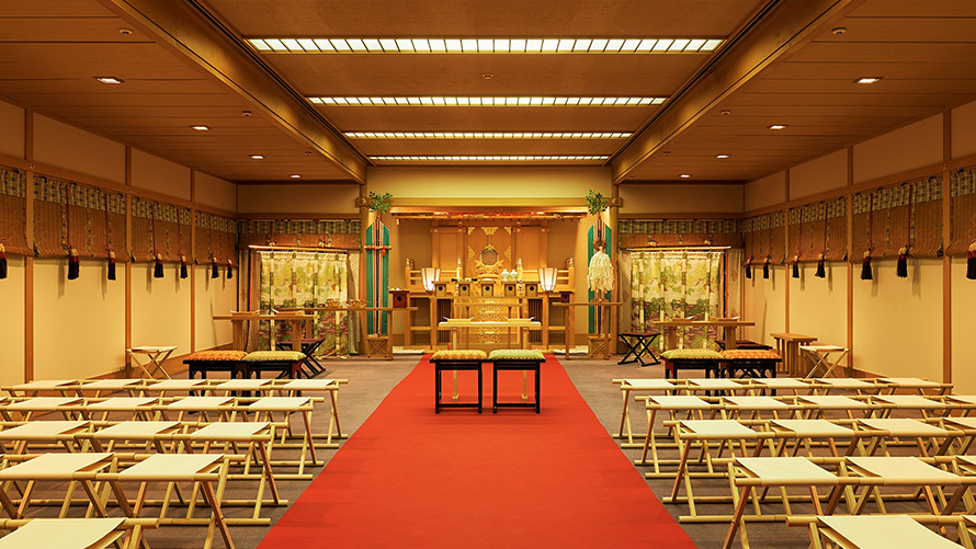 日本古来からの伝統にのっとり永遠を誓うこの空間は、神聖な雅楽が流れ、凛として清らか。