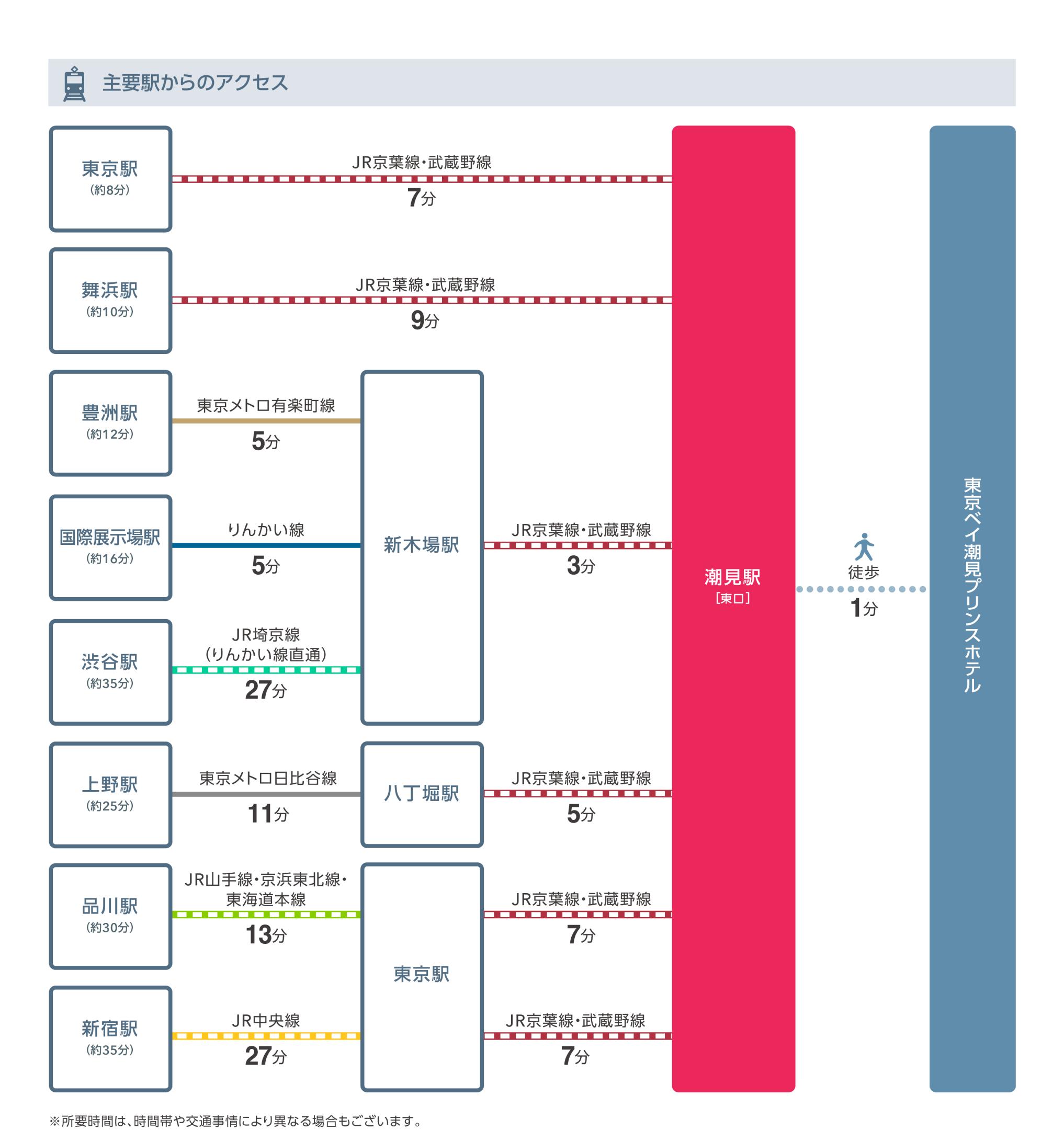 駅名 路線名・出口 徒歩 潮見駅 JR京葉線・武蔵野線 東口 約1分 ※所要時間は、時間帯や交通事情により変更となる場合もございますので、あらかじめご了承ください。