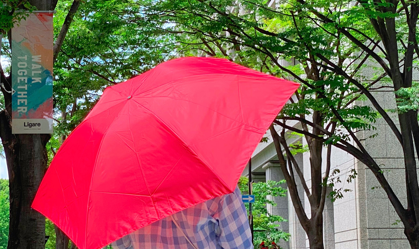 最先端の撥水加工を施した「超耐久撥水の晴雨兼用折畳傘」(¥6,600/税込)だから、これから先も永いお付き合いができそう。早速、傘が映える緑の下でパチリ♪