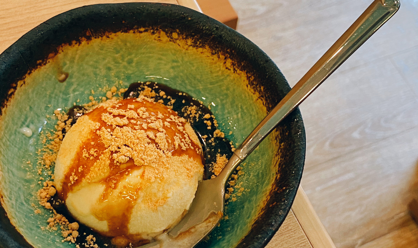 アツアツのもんじゃ焼きの後に食べるアイスクリームの美味しさは、言わずもがな。黒蜜きなこの素朴な甘みも手伝って、至福の余韻に包まれるのでした。