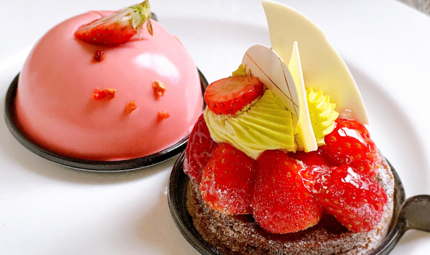パイ生地の上にイチゴとカスタードクリーム、ピスタチオクリームが載ったタルトフレーズ(写真右)は、甘酸っぱい中にもピスタチオのコクを感じる大人のひと品。
