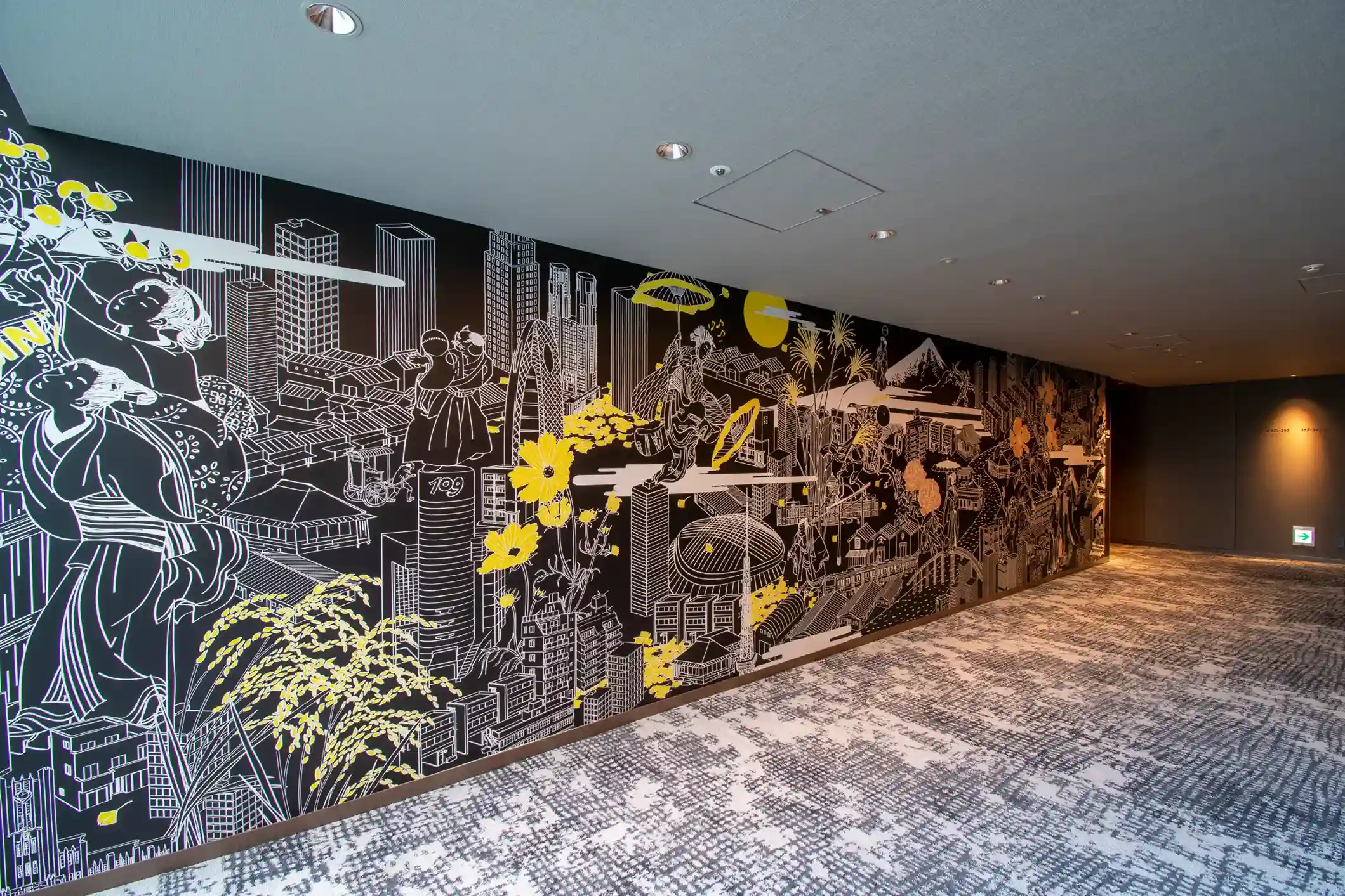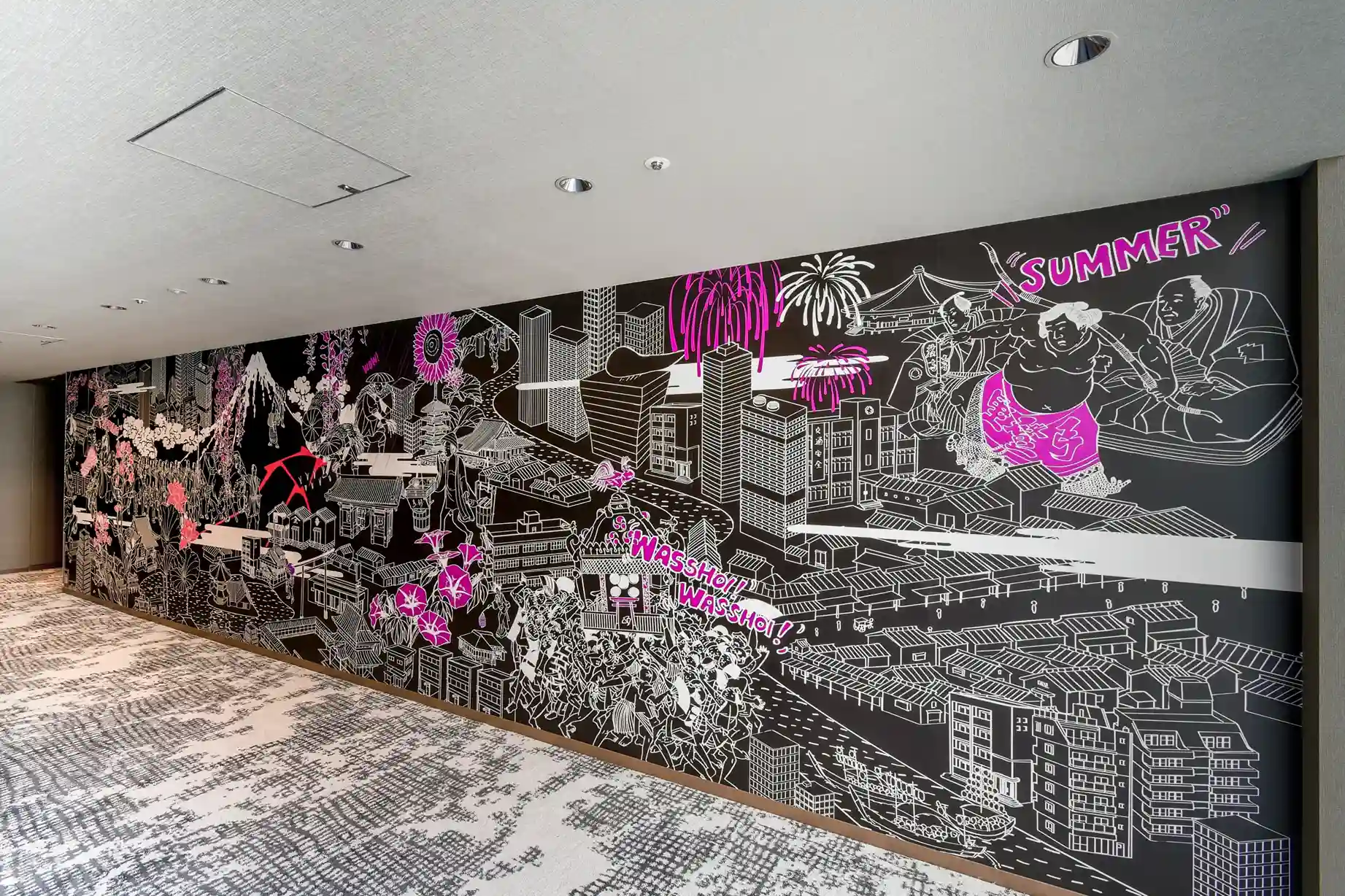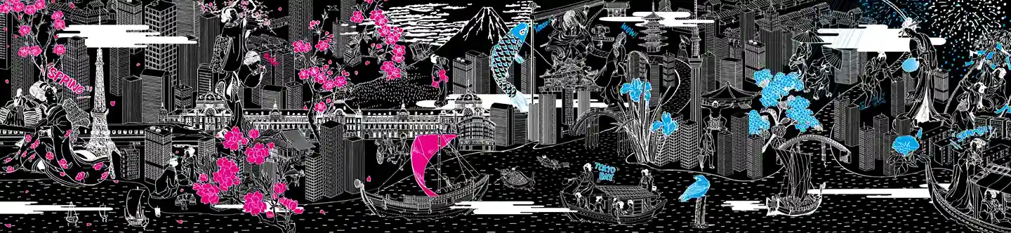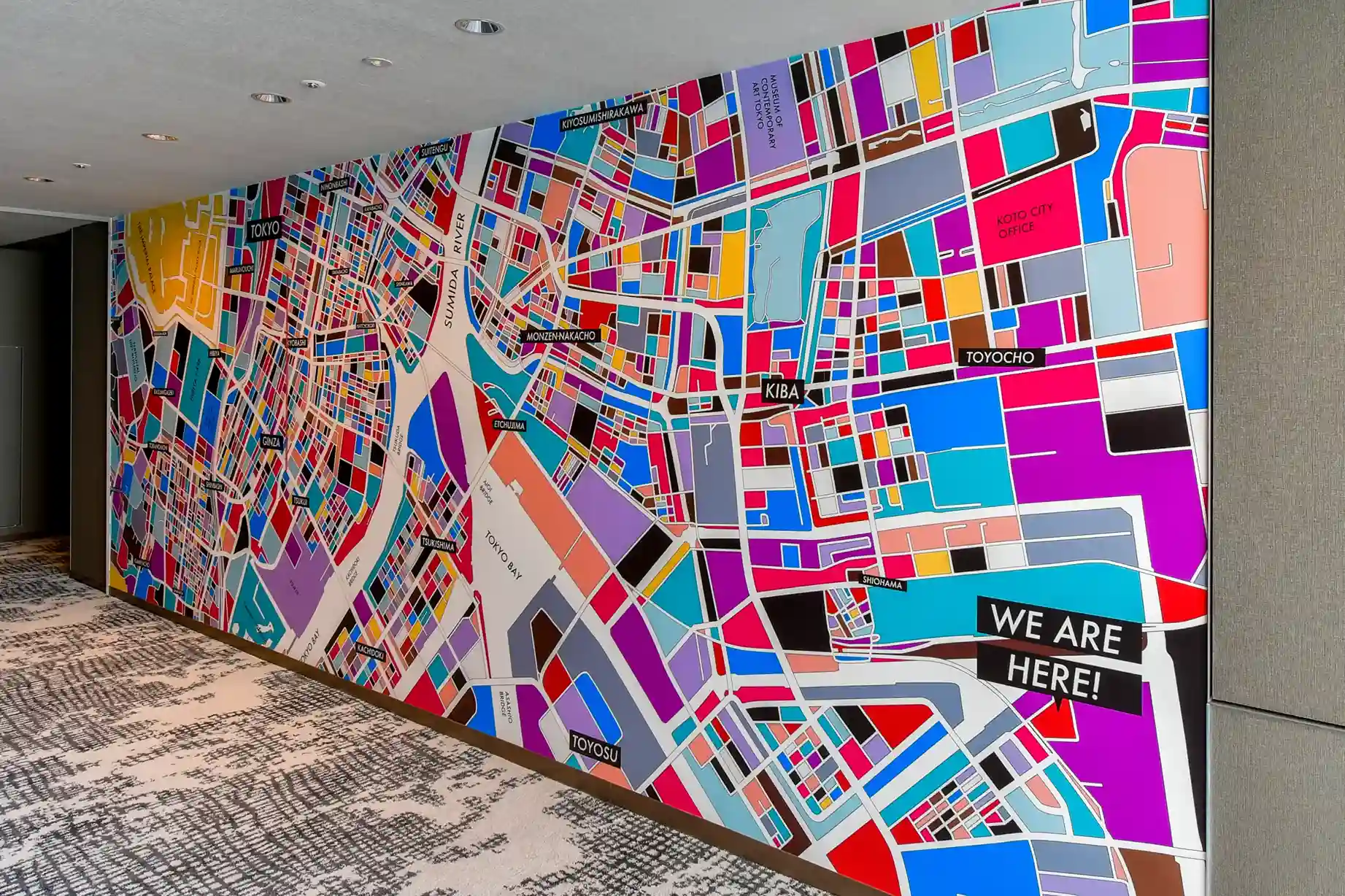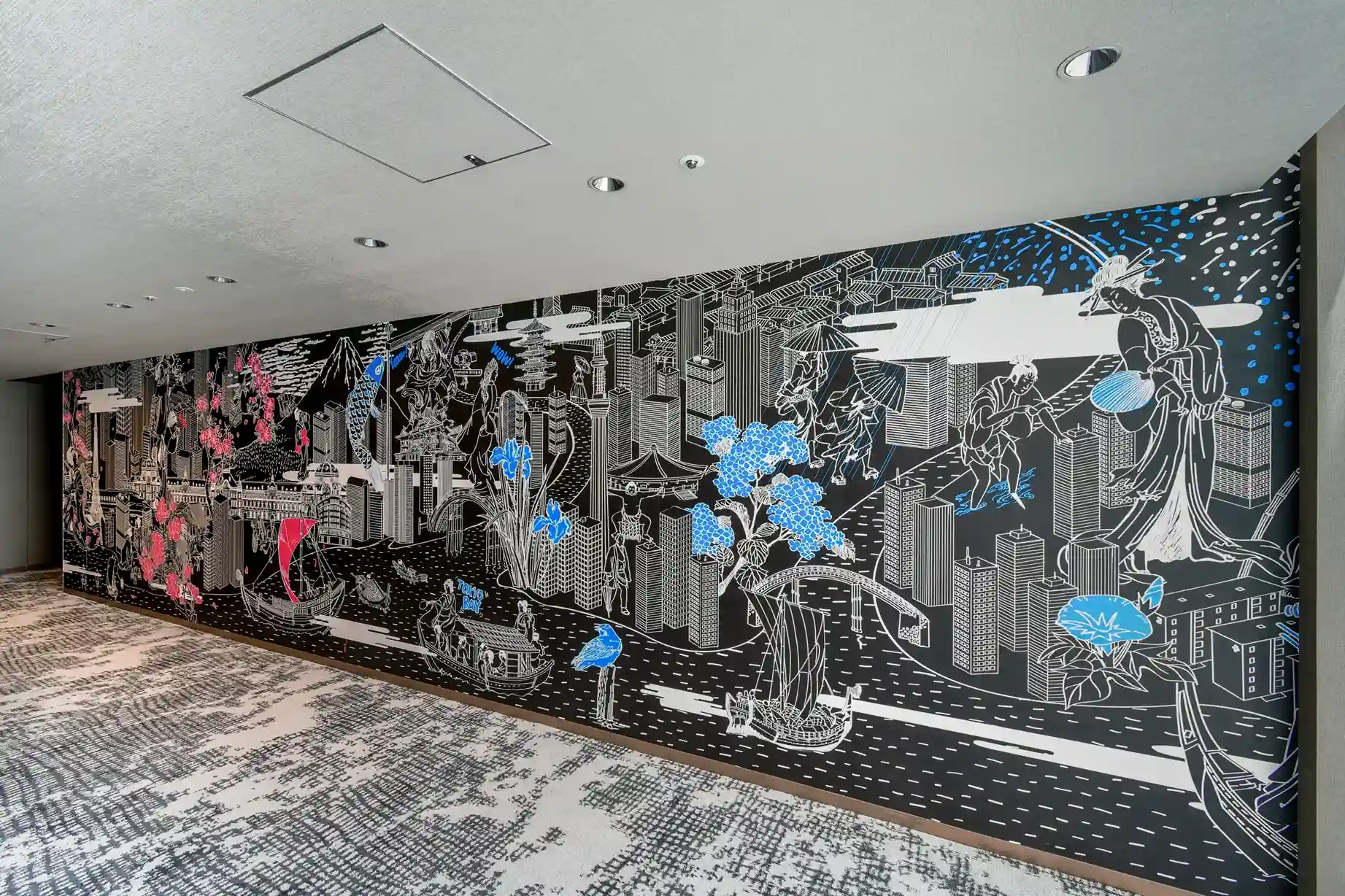 時代の移ろいとともに変化した潮見の歴史や、四季折々の街並みを表現したアートに感じる大都市のエネルギー。館内を歩くたびに表情を変えるグラフィックは必見です。