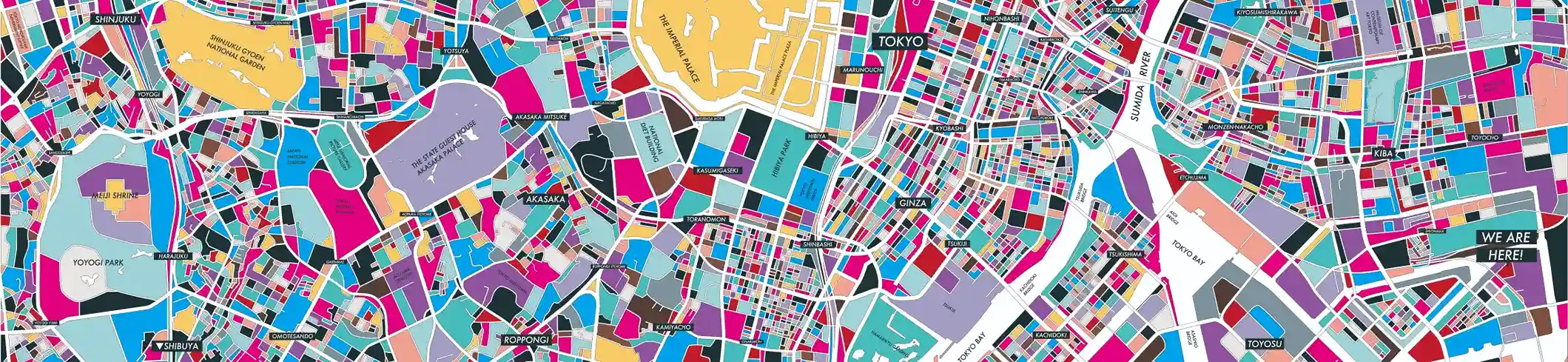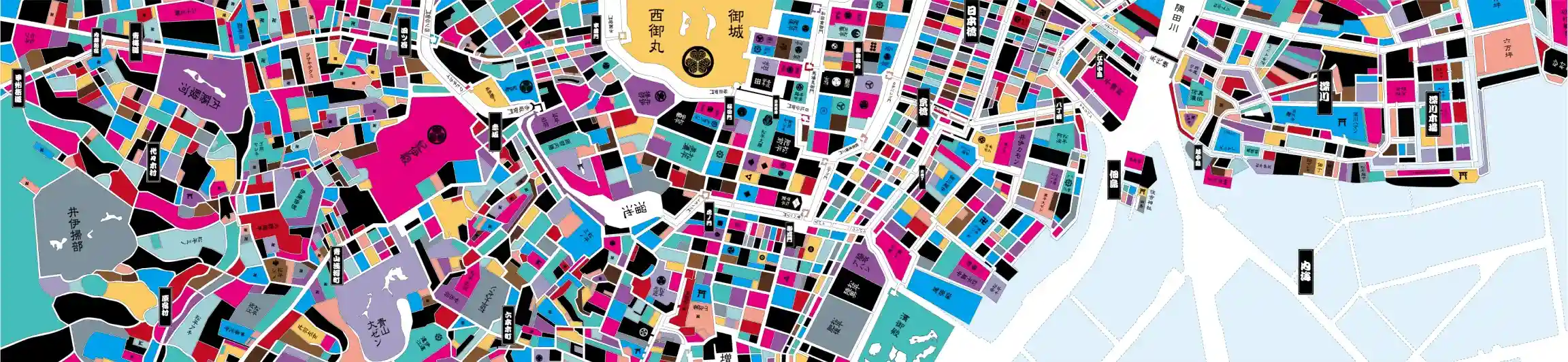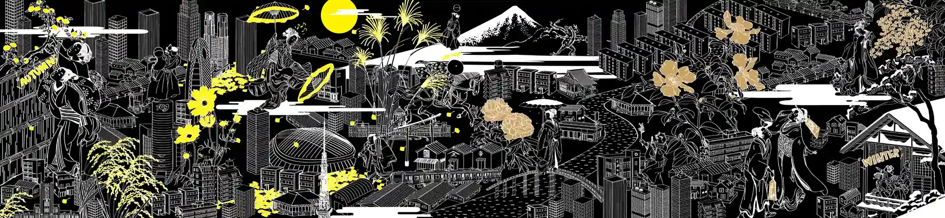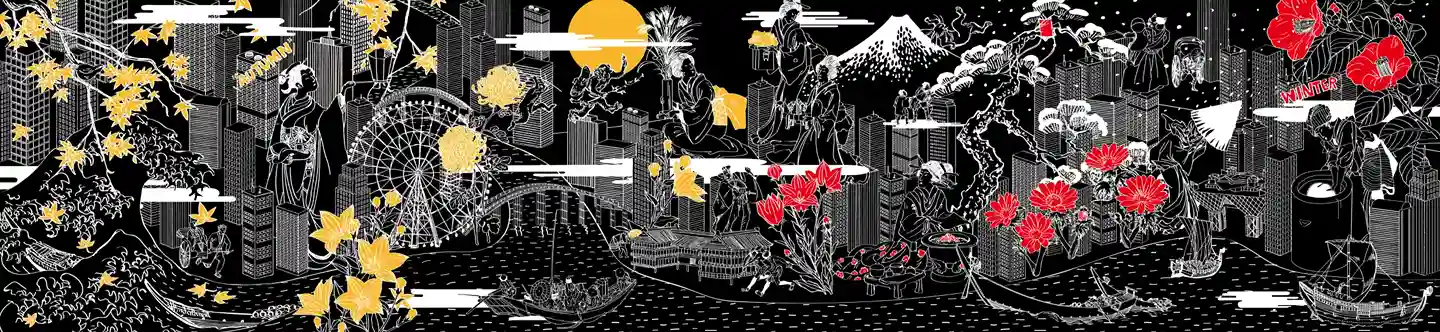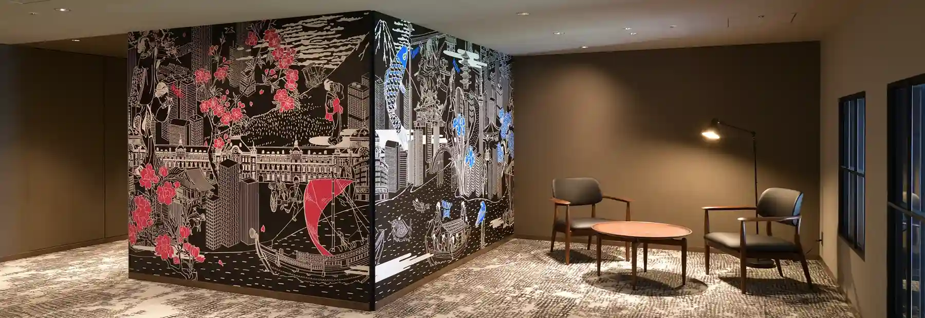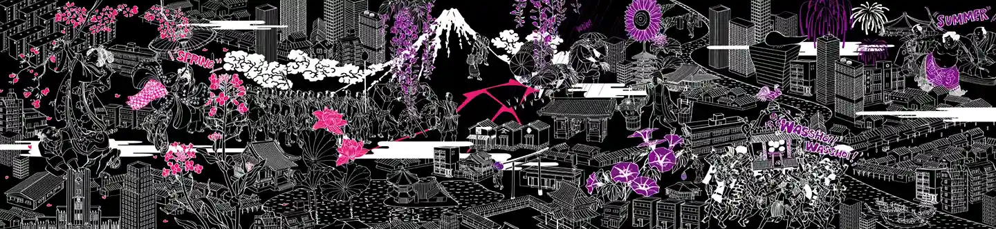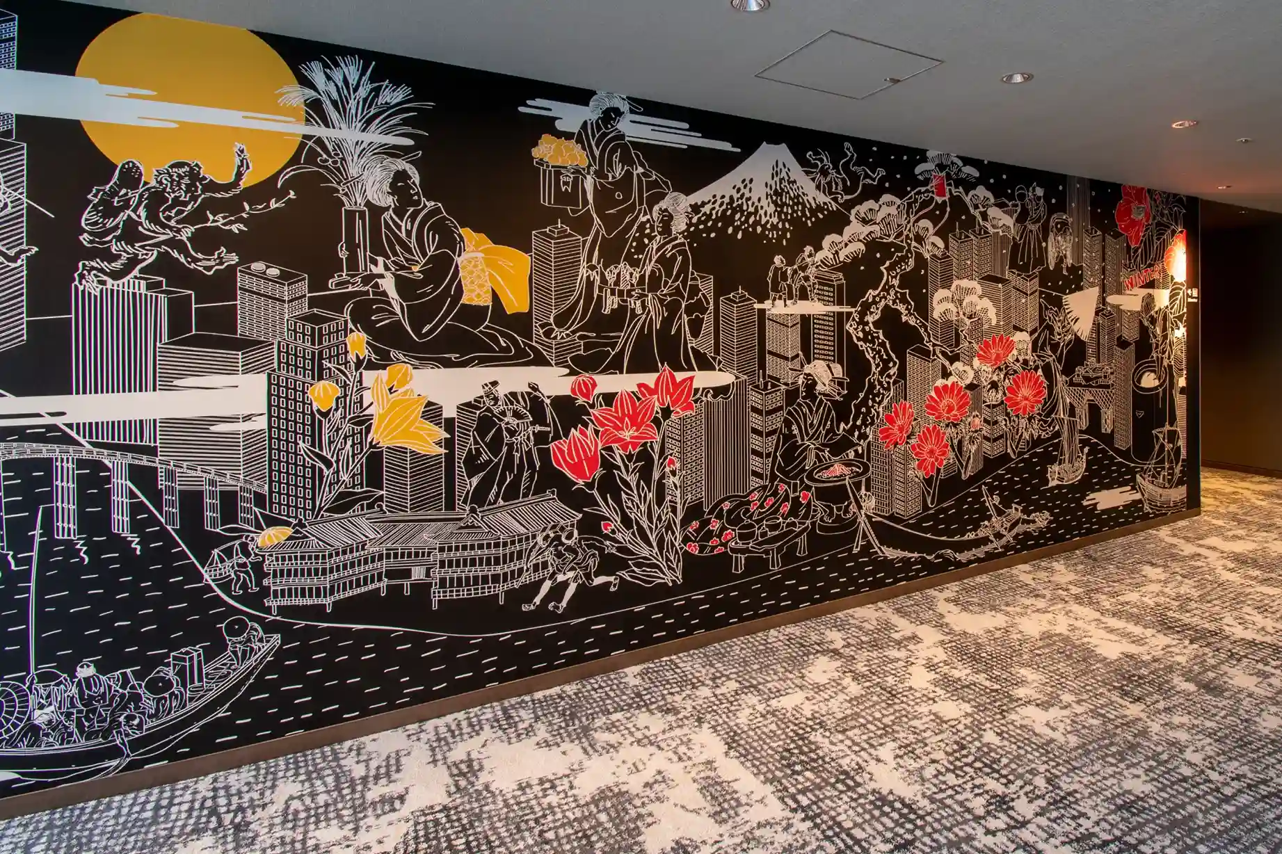 時代の移ろいとともに変化した潮見の歴史や、四季折々の街並みを表現したアートに感じる大都市のエネルギー。館内を歩くたびに表情を変えるグラフィックは必見です。