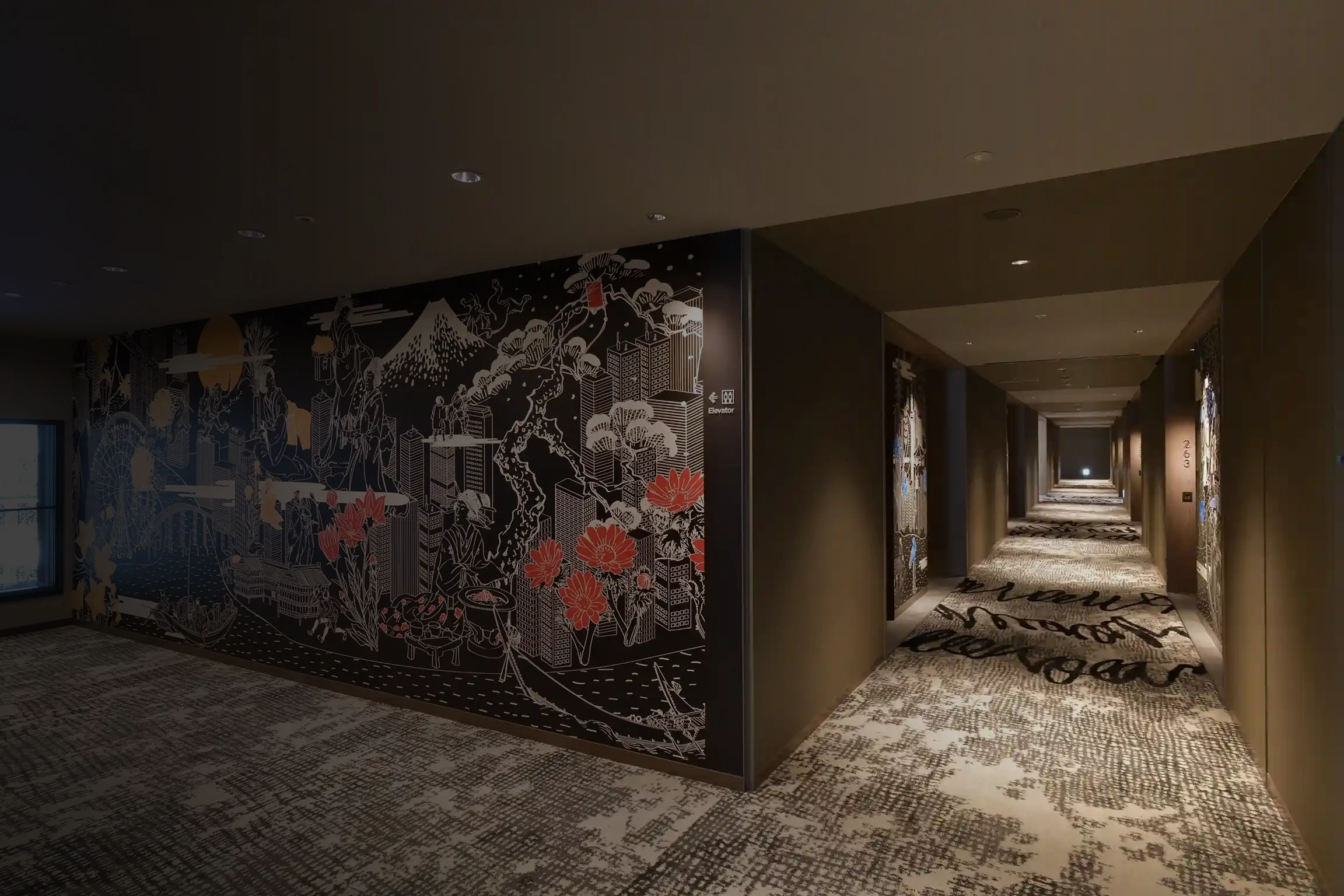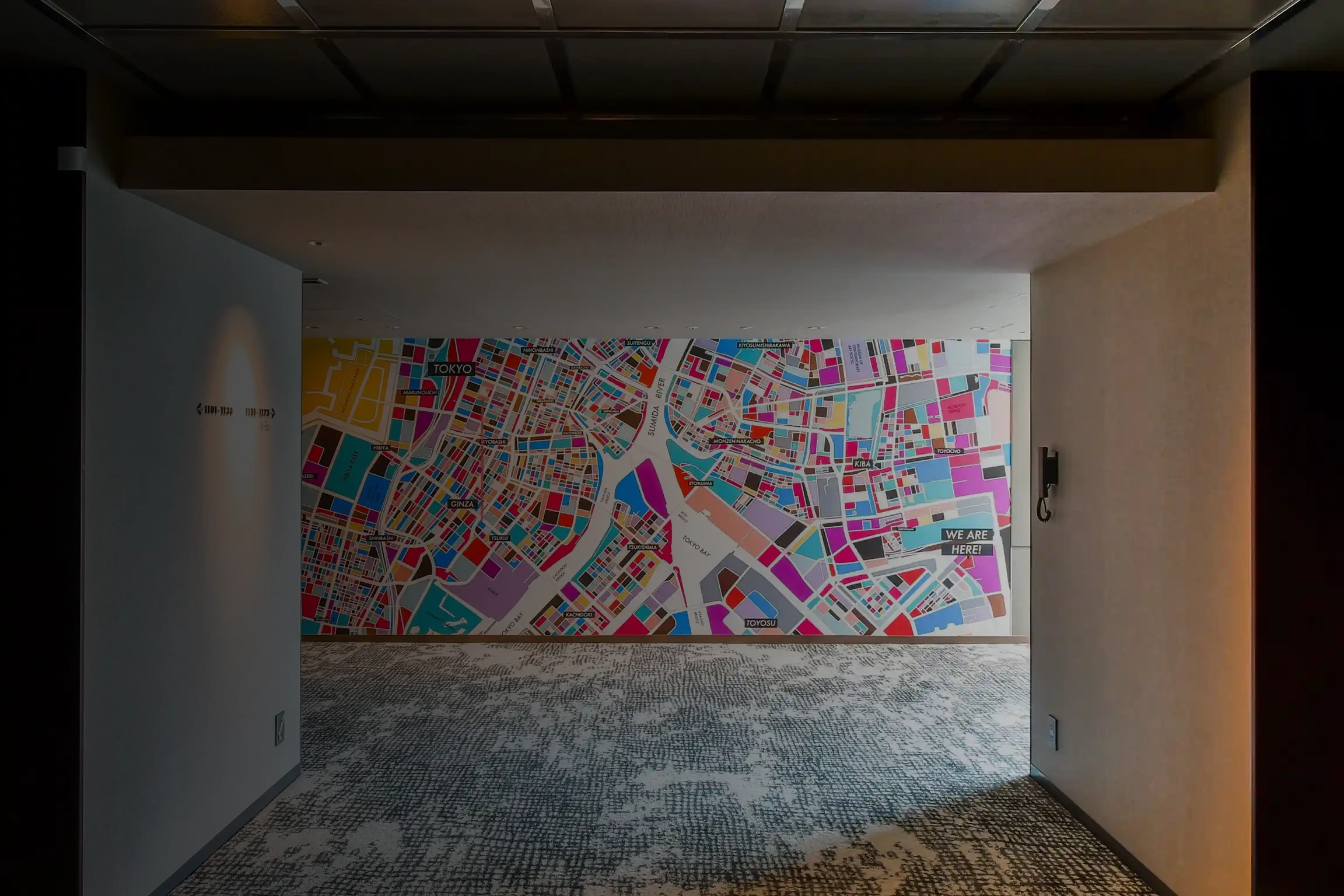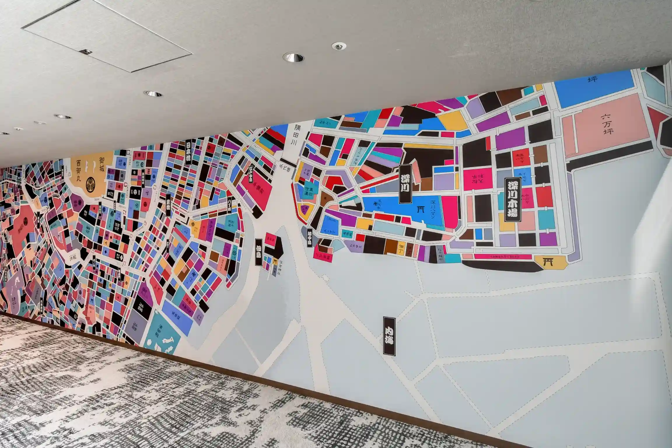 8F以上は「Past and Present 今昔」をテーマに江戸と令和の地図を表現したフロアアートになっています。江戸と令和の違いを照らし合わせて見比べるのもこのアートの楽しみ方です。