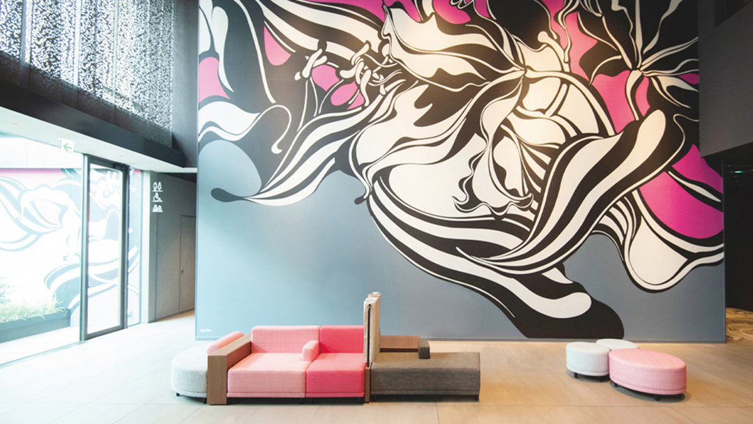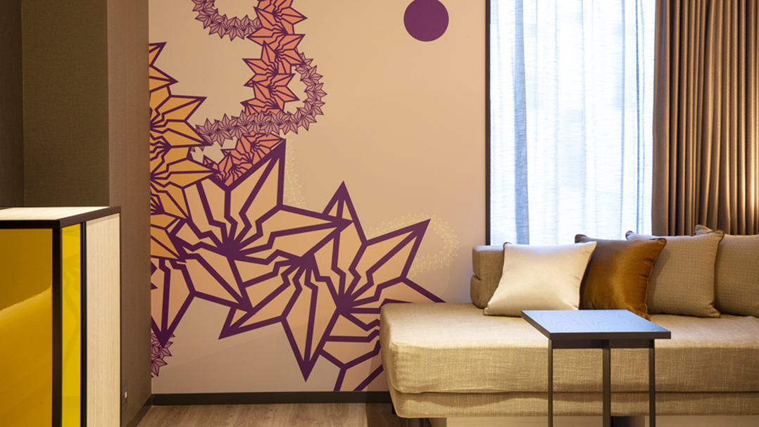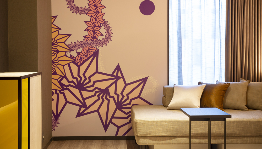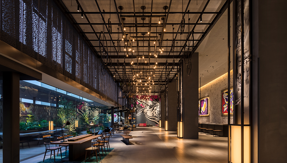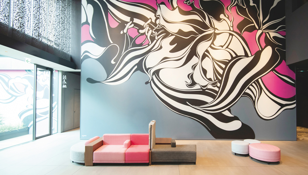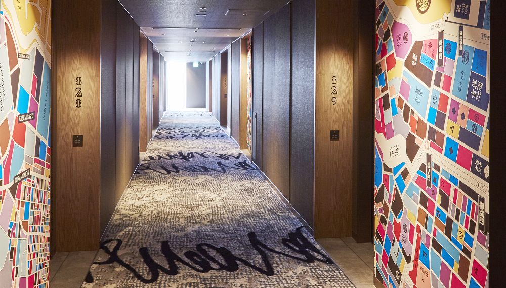 百合の花を波に見立てた一面の壁画が、圧倒的な存在感を放つロビー。天井には海運を彷彿とする滑車や、時代とともに変化を遂げてきた象形文字、水鳥のオブジェなど、“旅”と“潮見”を多様に解釈したアートがそこかしこに。廊下やお部屋に至るまで、8人のアーティストによる作品は見ればみるほど興味深く、カラフルな世界への没入体験は、旅を鮮やかに印象づけます。