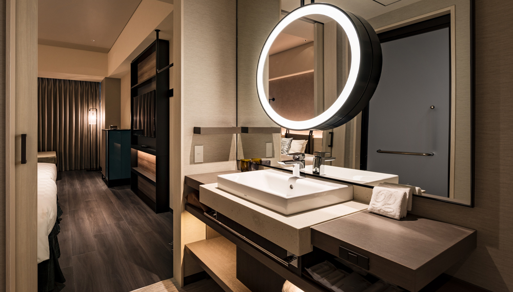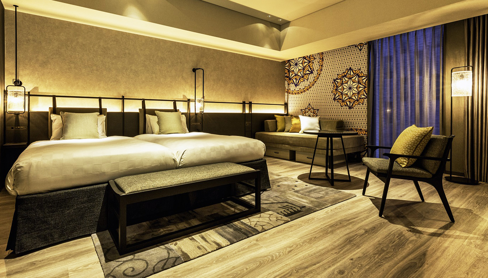 ウォールアートが印象的でゆったりとしたお部屋は、思わず写真を撮ってシェアしたくなる空間です。ハリウッドミラーやシモンズ社製のベッドなど充実の設備に加え、1部屋に最大4人で宿泊できることもポイントのひとつ。ファミリーやグループで、ゆとりある“映え旅”を楽しめます。