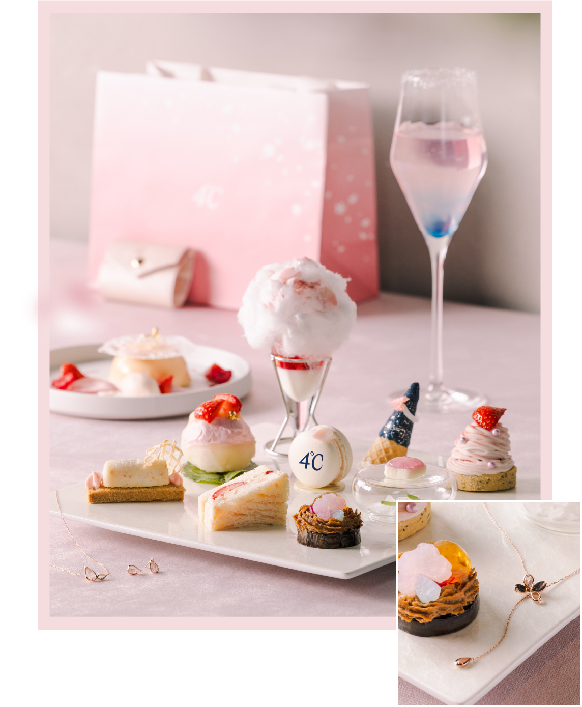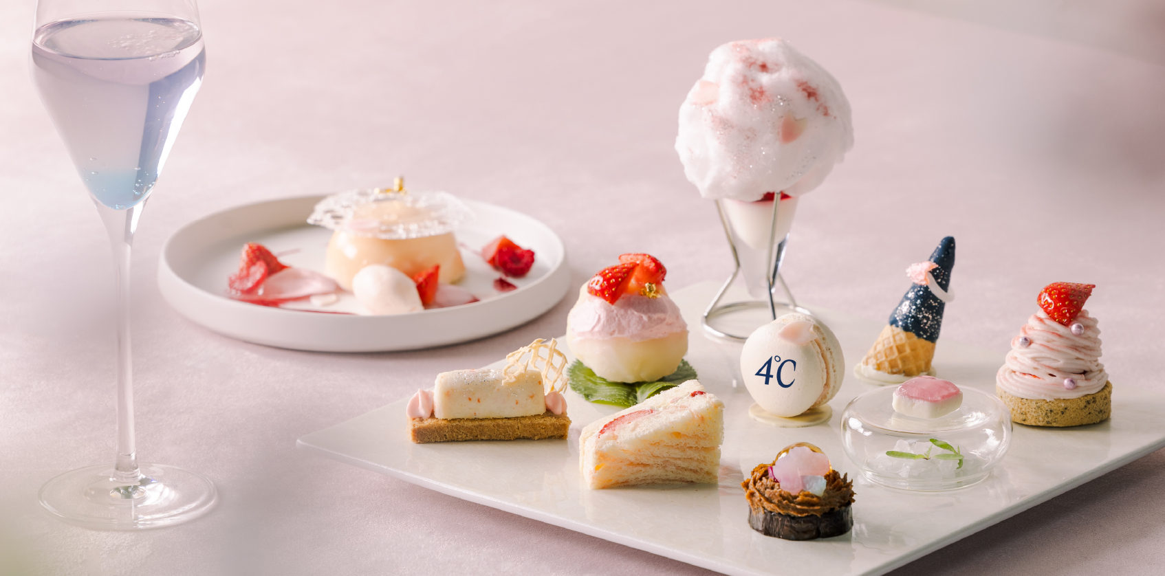 都会の喧騒から離れた静謐な水辺に咲く、美しい桜。儚くもみずみずしく咲き誇る桜がこの時期だけのスイーツとなってお皿の上を彩ります。ご自分へのご褒美や、ご家族・ご友人とのお出かけに、心に潤いを与える優雅なティータイムをお楽しみください。