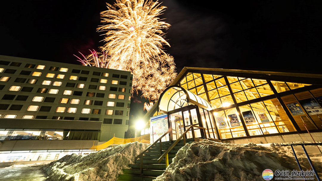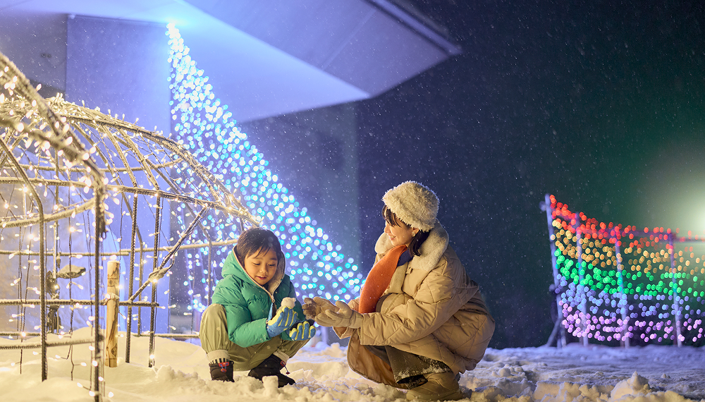 雫石町のテーマの虹とホテルの目の前に広がる壮麗な岩手山をモチーフにしたイルミネーション、そして、夜空を奏でる打ち上げ花火など、幻想的な冬の夜を鮮やかに彩ります。
