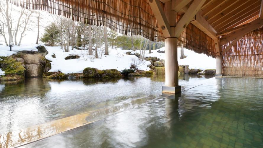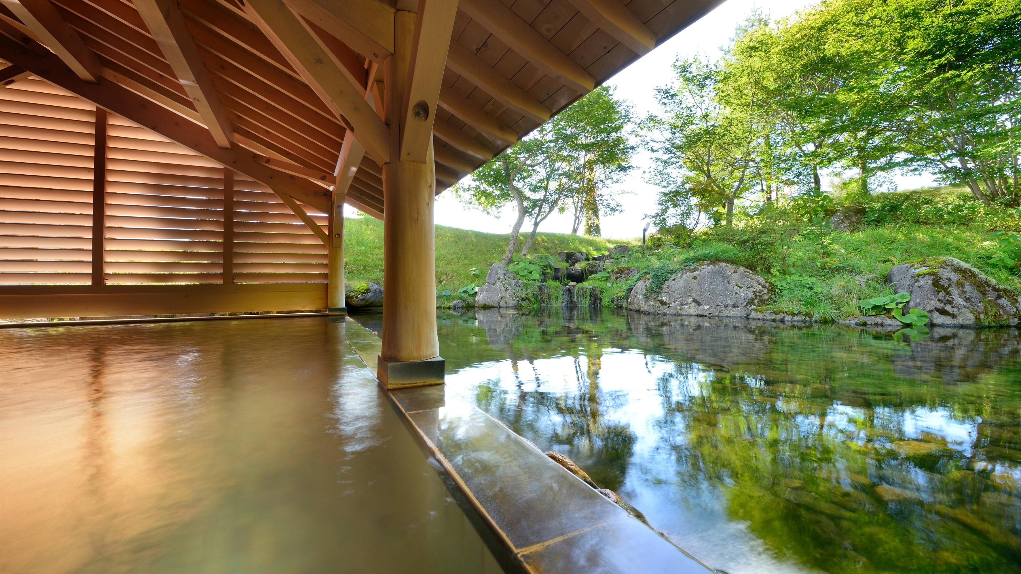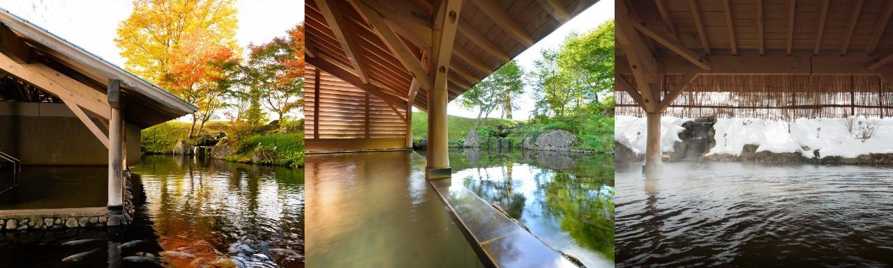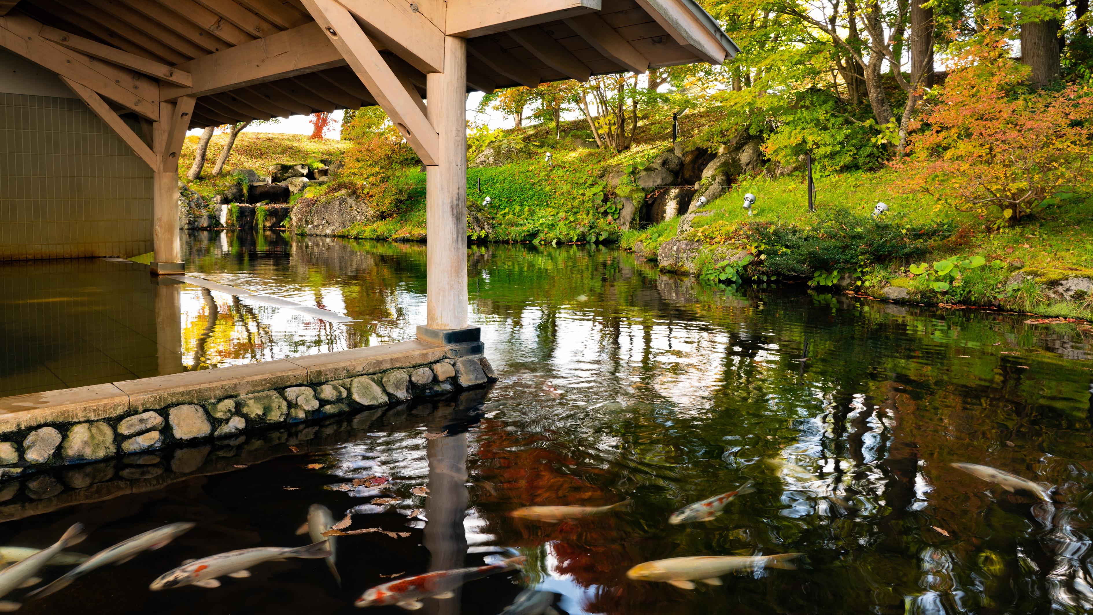 春は新緑、夏は深緑、秋は紅葉、冬は雪見と四季を感じられる趣ある温泉露天風呂です。すぐそばには池があり鯉が泳ぐ姿も間近に見られます。