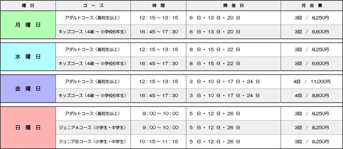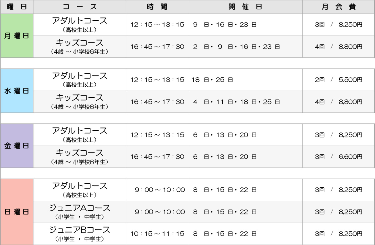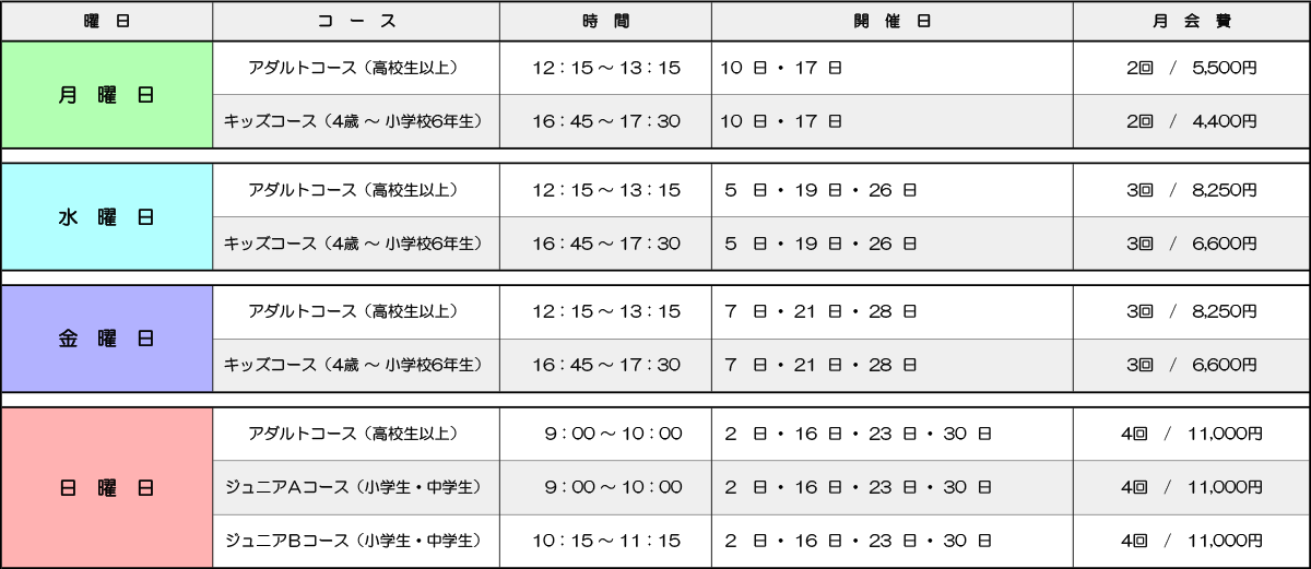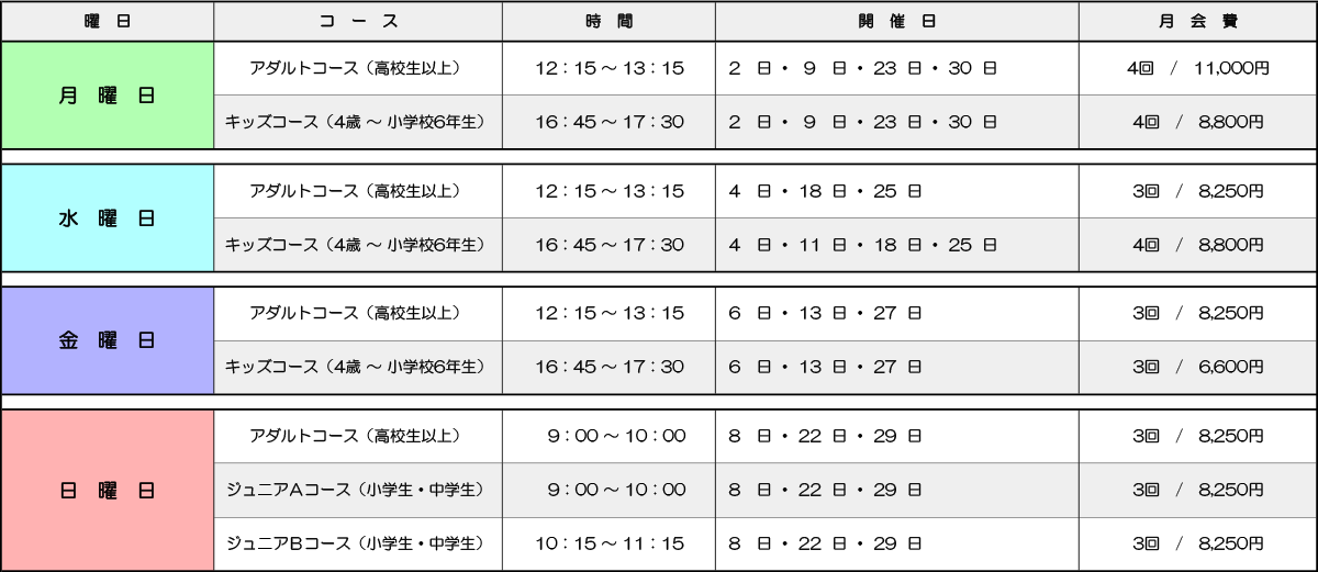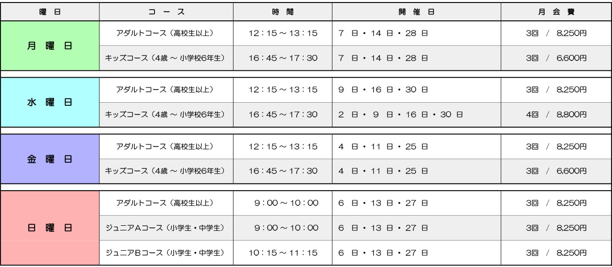 | 曜日 | コース名称 | 対象 | 開催時間 | 定員 |