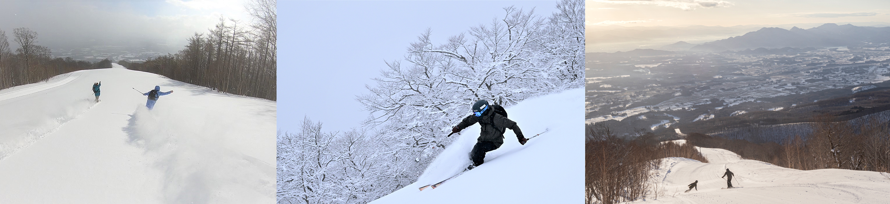 まだまだ絶景探しとパウダーライドは終わりません。ここからは雫石ロープウェーに乗り換えて、リフトを乗り継いでサンシャインの山頂へ。岩手山の麓から広がる雫石盆地や、盛岡市の街並み、南東には岩手最高峰の岩手山に次ぐ標高の早池峰山を望める、素晴らしい絶景です。記念撮影の後は、非圧雪のジャイアントスラロームC1コースで、さらにパウダーを楽しみましょう。