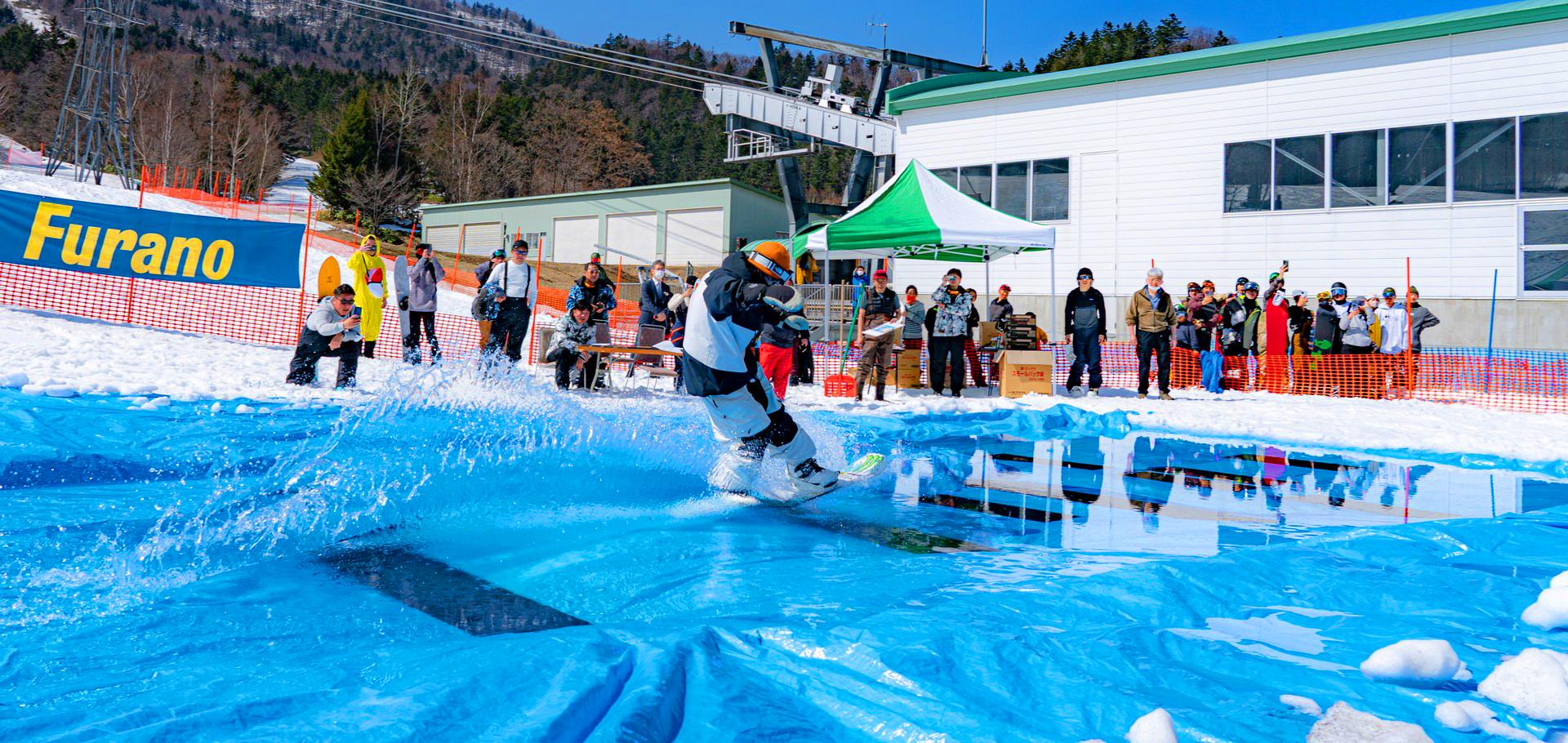 富良野スキー場の人気イベント「春スキー池渡り大会」!全長約10メートルの池をスキー&スノボで渡るチャレンジャーたちと一緒に楽しもう!パフォーマンスによりステキな景品がもらえるかも!