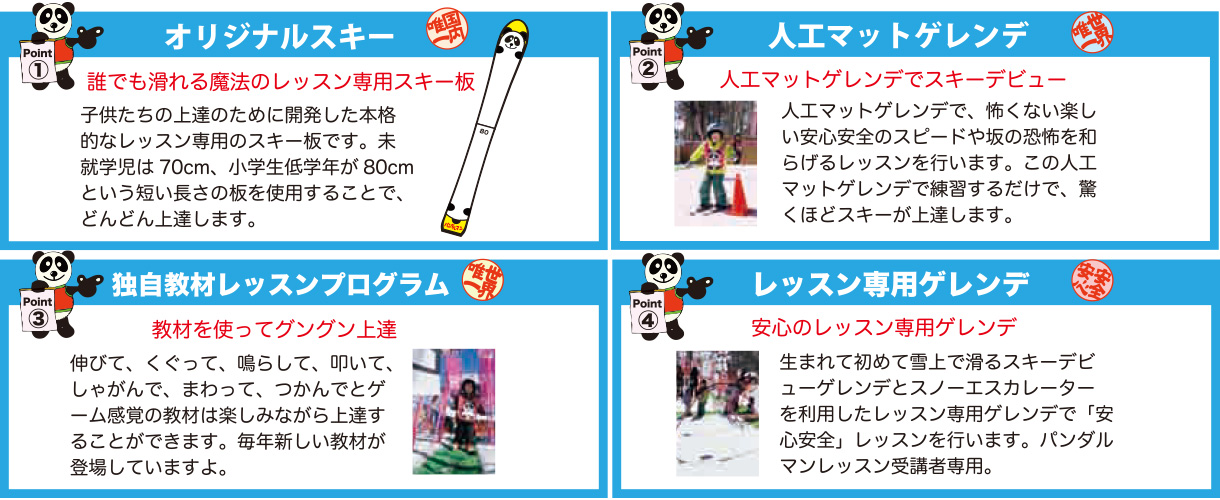 パンダルマン キッズスクールは、世界唯一のキッズスキーマジックレッスンプログラムです。初めてのスキーを安全で楽しみながら上達していくマジックレッスンでこども達の最高の笑顔のためにレッスンを行っていきます。