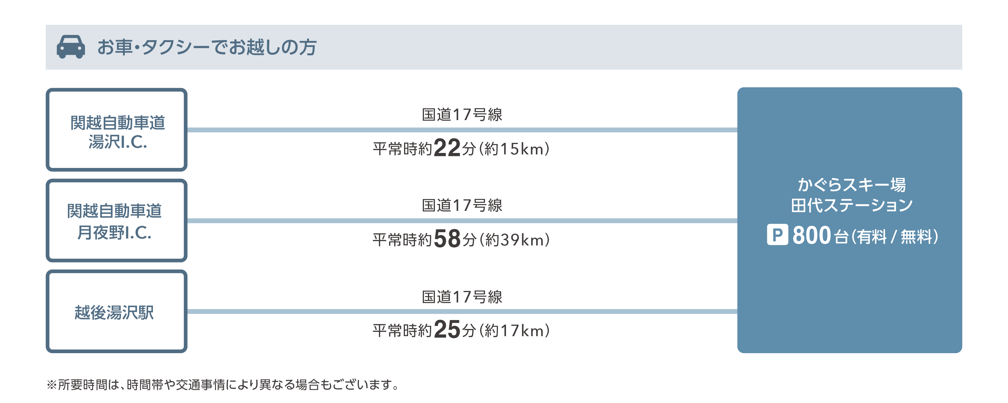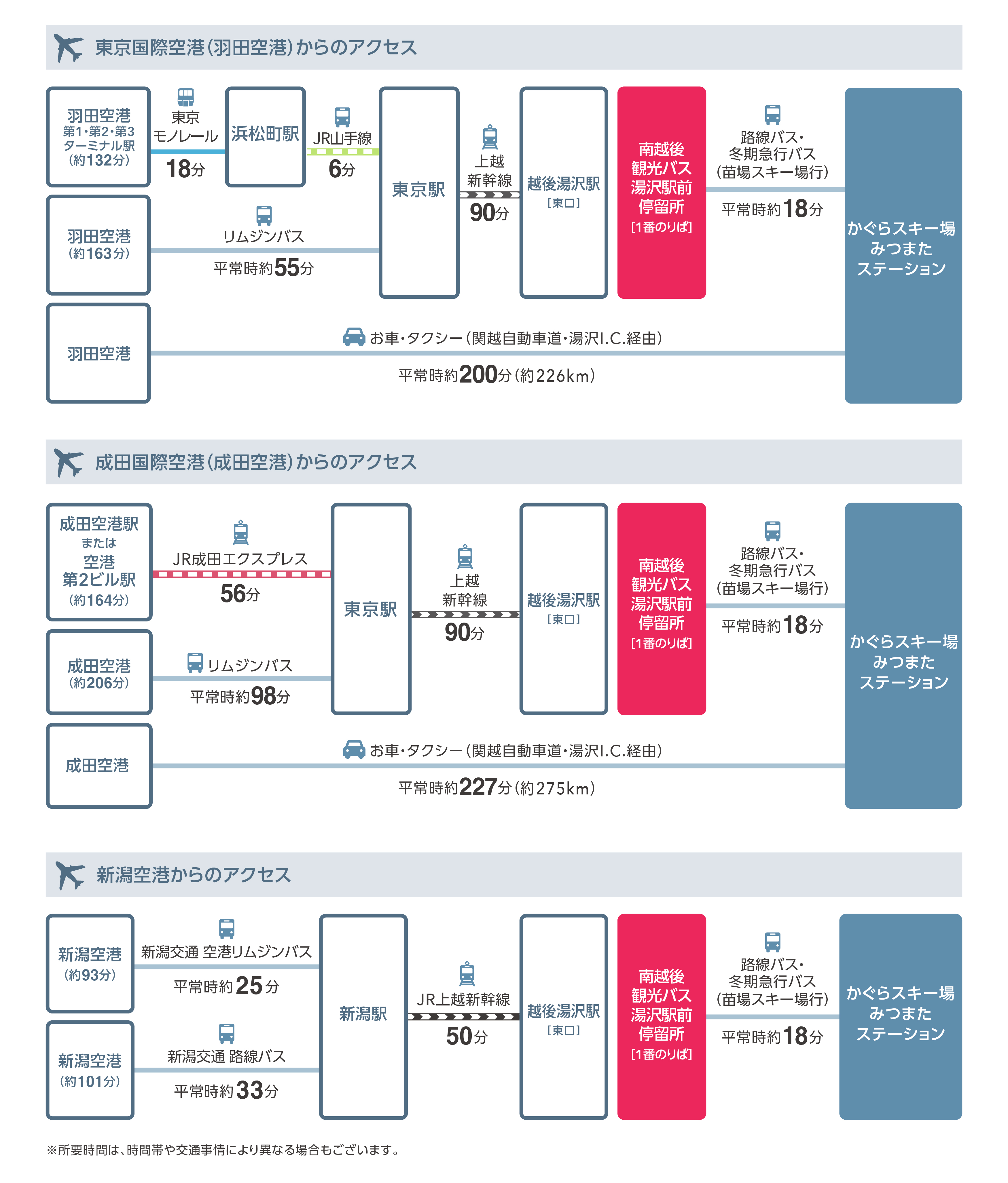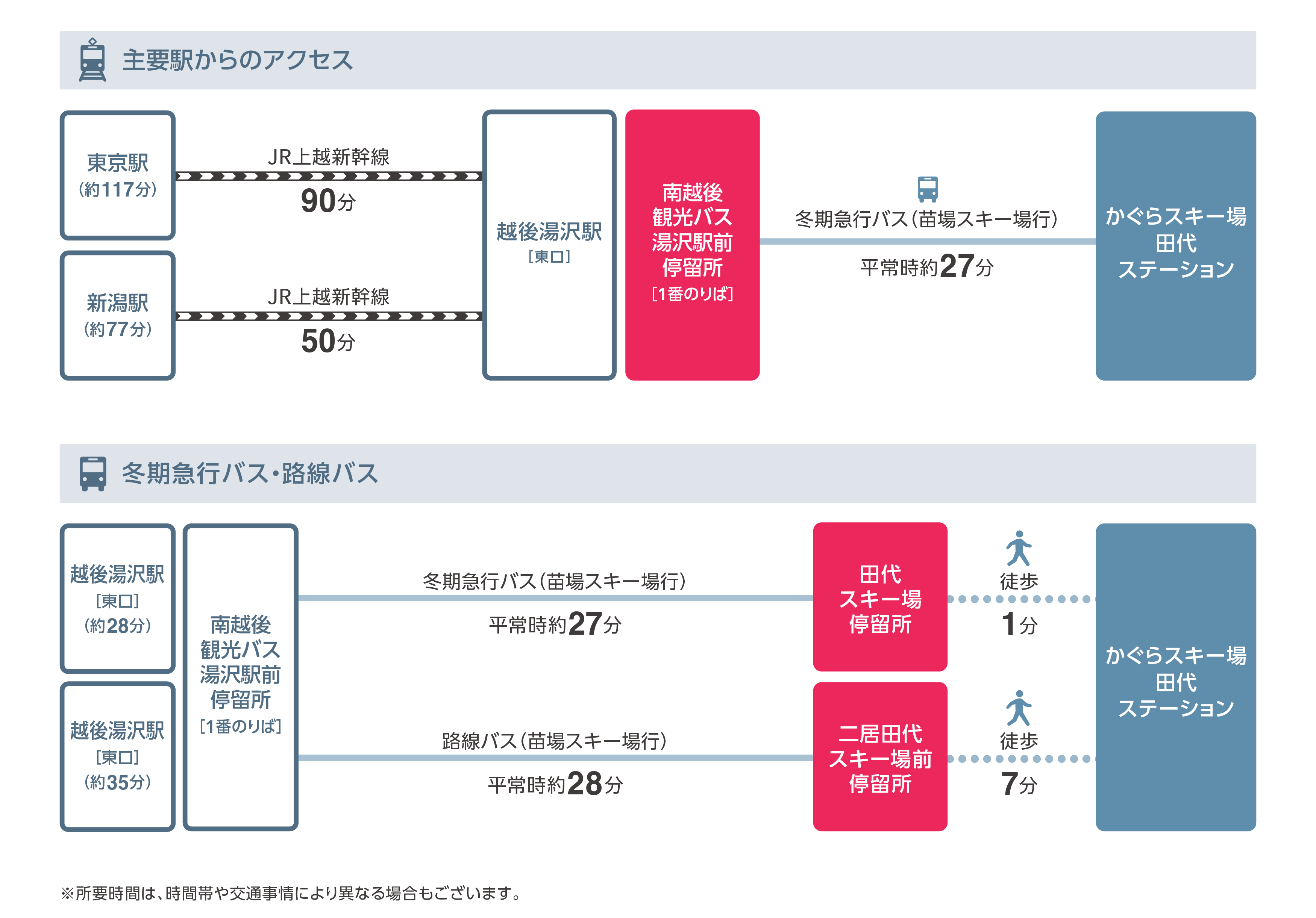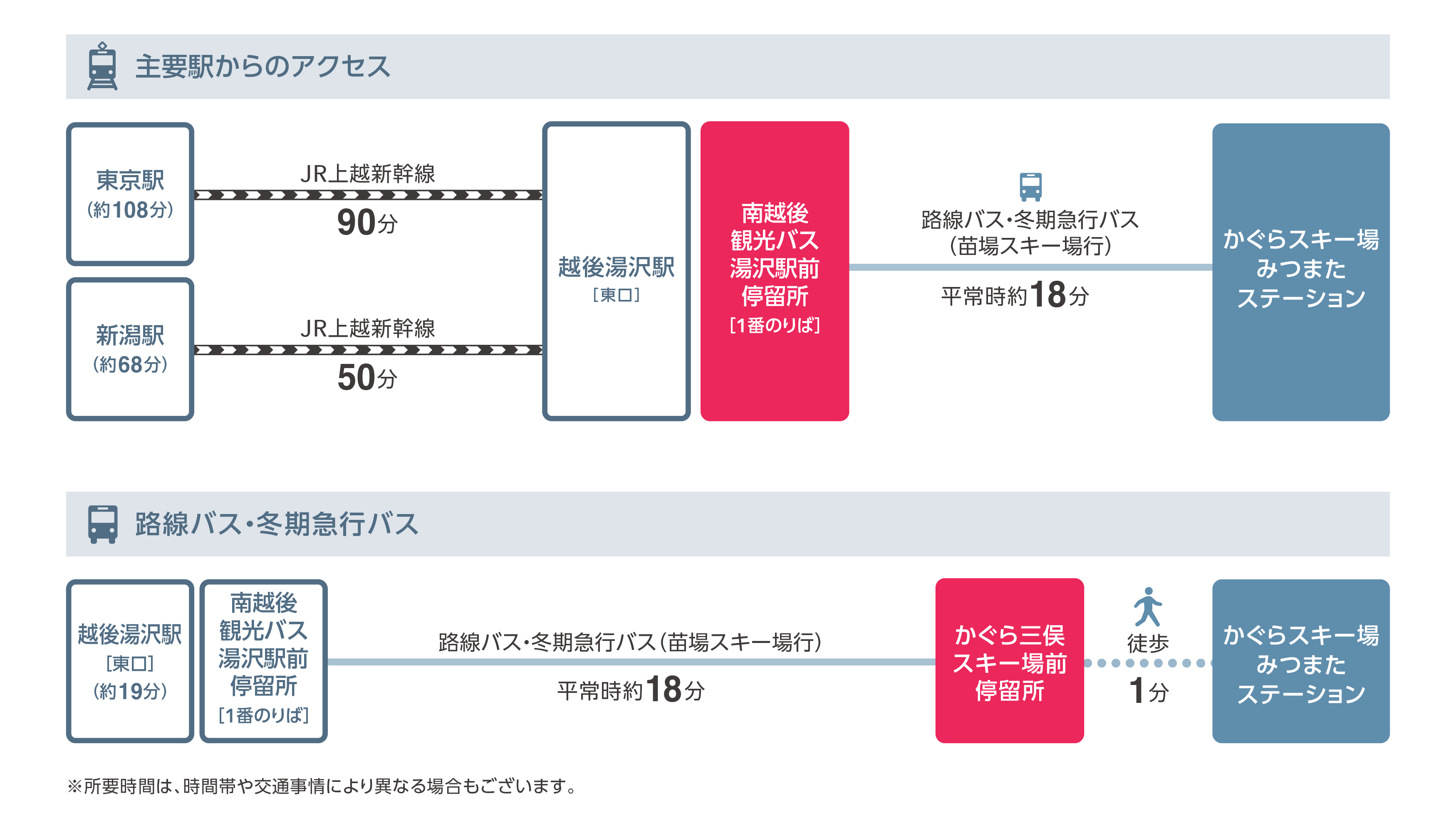 みつまたステーション 〒949-6211 新潟県南魚沼郡湯沢町三俣742 TEL:025-788-9221 / 田代ステーション 〒949-6212 新潟県南魚沼郡湯沢町三国1066 TEL:025-789-3111