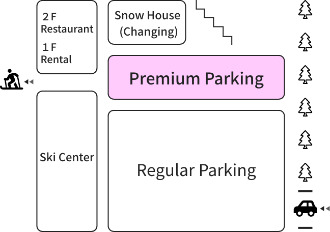By pre-purchasing a Premium Parking ticket online, you'll have access to a parking space that's 1.5 times larger than a regular one, conveniently located near the ski area's main facilities, including the Center House with lift counters, rentals, changing rooms, and Snowman Park for children.