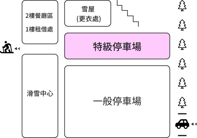 距離吊椅纜車售票處、租借處、更衣室、以及供孩童玩耍的雪人公園都很近,非常方便!