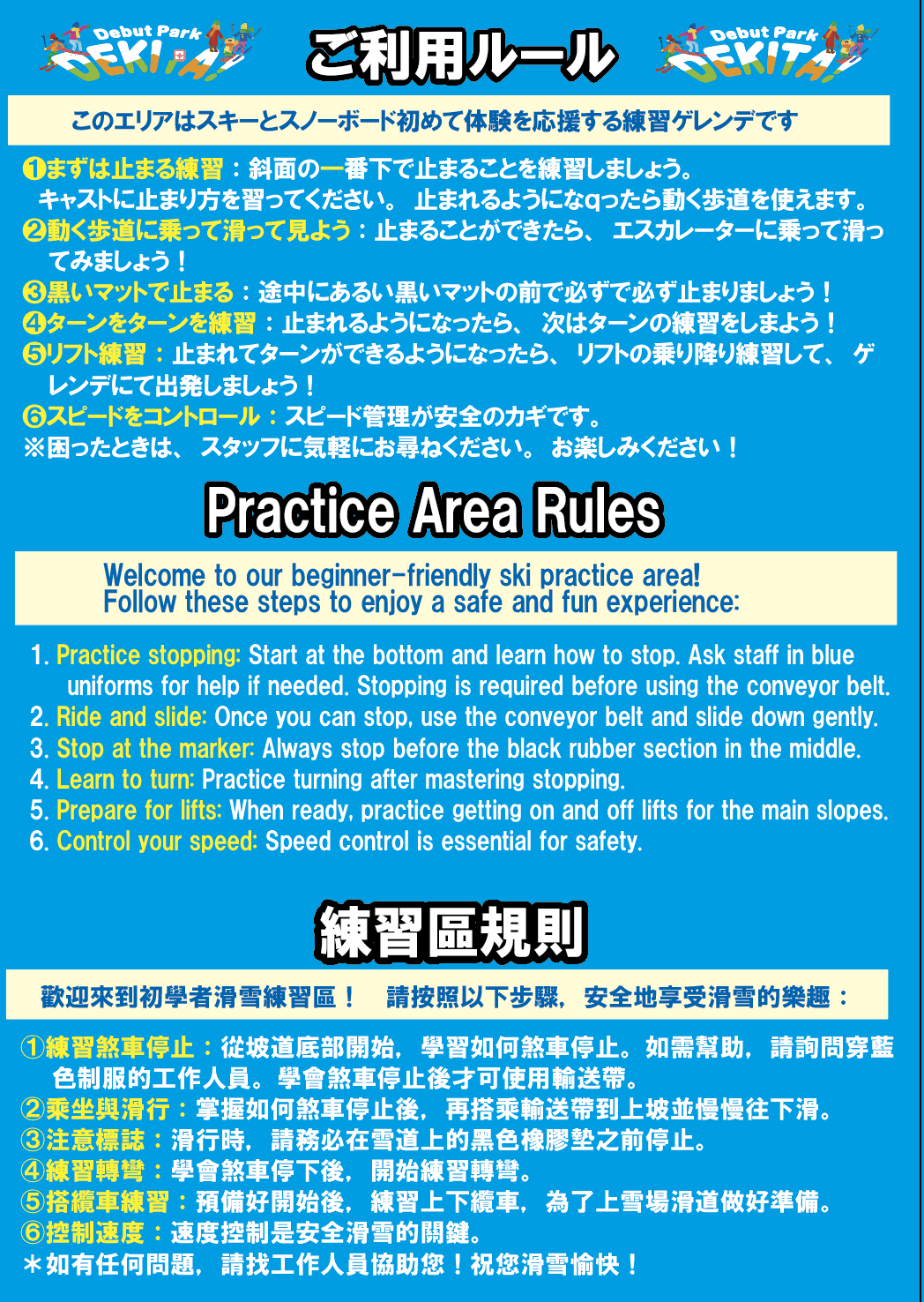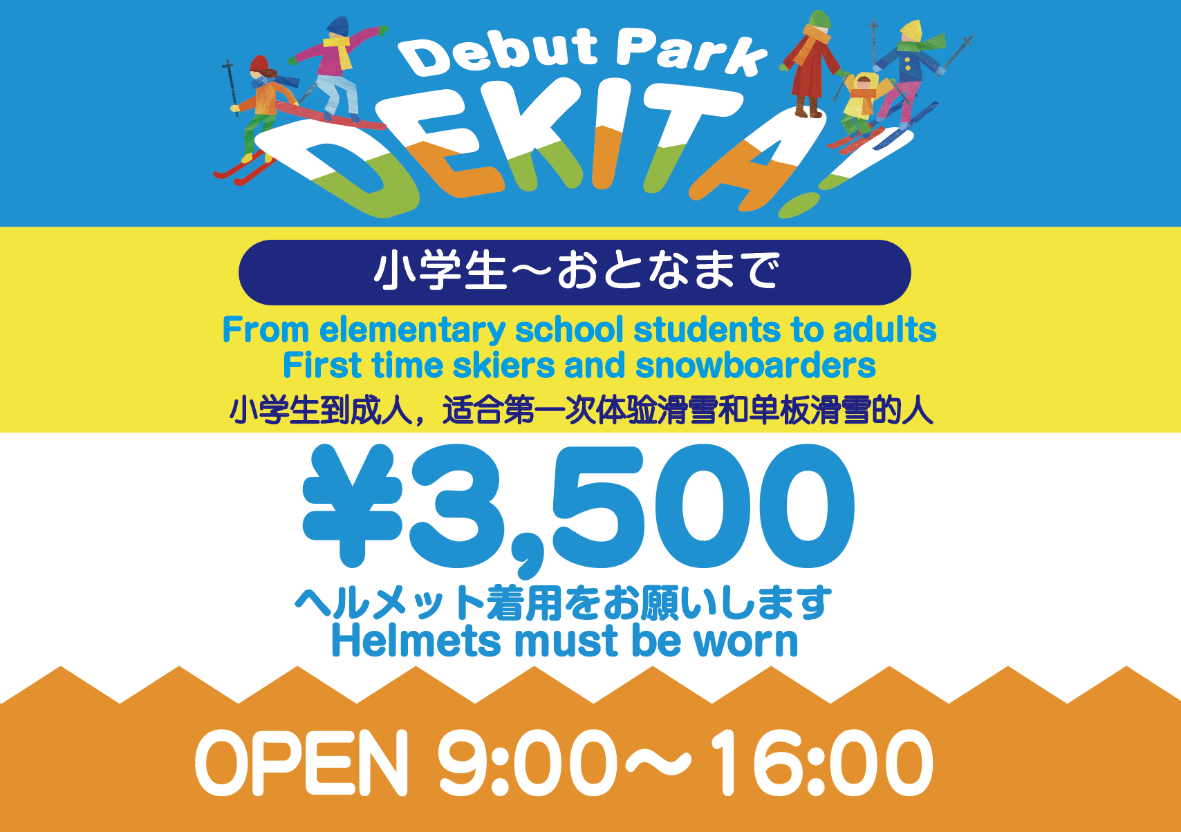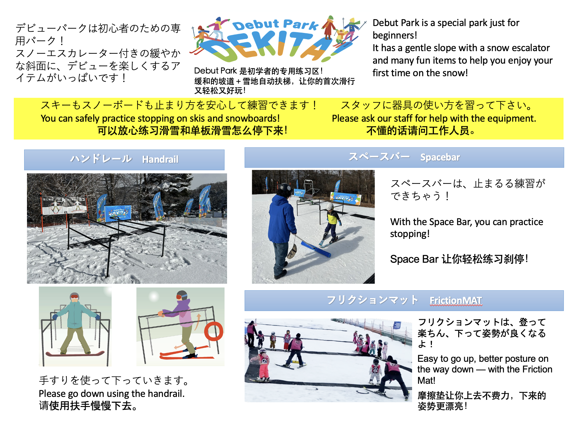 DebutPark DEKITAは初心者のための専用パーク!スノーエスカレーター付きの緩やかな斜面に、デビューを楽しくするアイテムがいっぱいです!