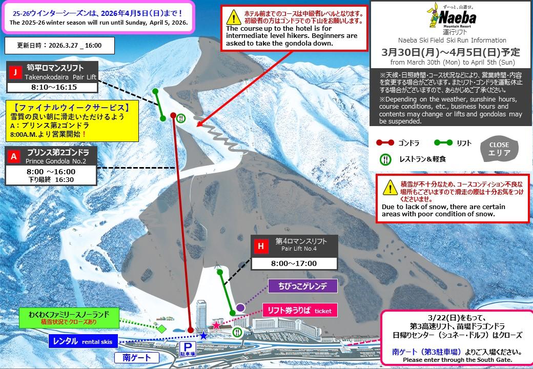 重要なお知らせ 営業時間 運行情報 3/30(月)~4/5(日)のリフト・コースオープン予定(3/27現在)
