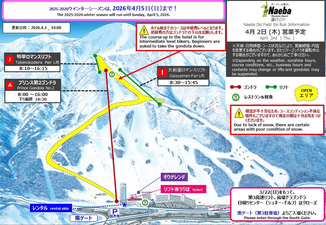現在のリフト運行、コースオープン詳細につきましてはこちらよりご確認くださいませ。 ※ナイター営業は終了いたしております。