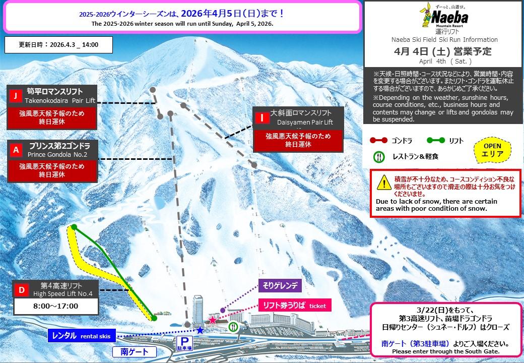 本日(4/4)は強風悪天候のためホテル前「D:第4高速リフト」のみの営業とさせていただきます。「A:プリンス第2ゴンドラ」を含む山頂エリアは終日運休とさせていただきます。大変ご迷惑をお掛けいたしますが、安全を最優先させていただきますのでご理解賜りますようお願い申しあげます。
