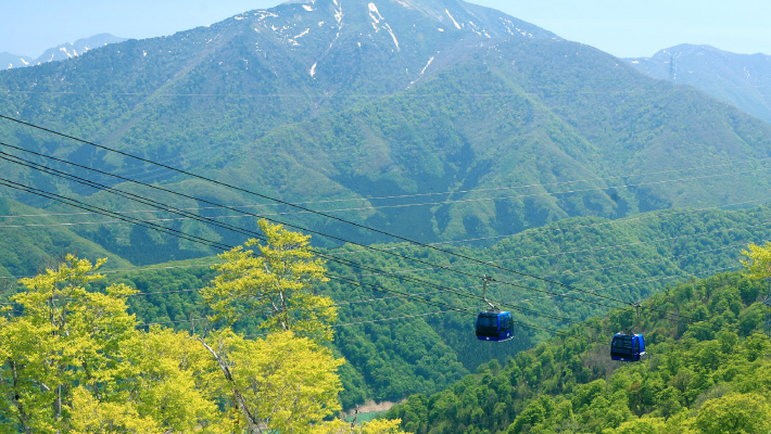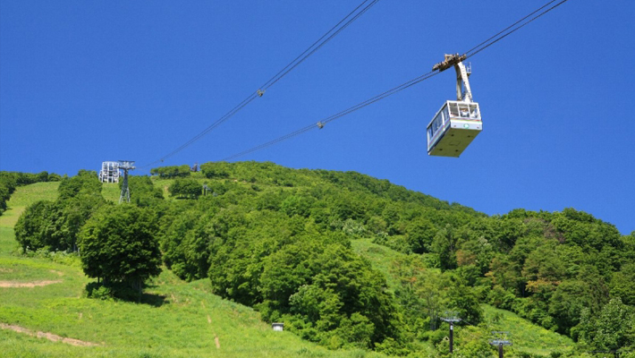 苗場プリンスホテルのある「なえば高原」と山頂に広がる「たしろ高原」を結ぶ日本最長のゴンドラ。道のり約5.5km、標高差約425m をアップダウンを繰り返しながら進むスリルと迫力はまさに圧巻。