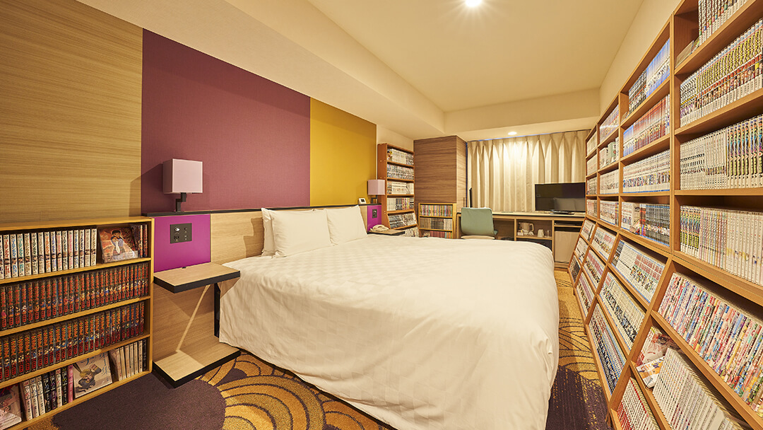 ~漫画に囲まれた自分だけのプライベート空間に浸る~ お部屋中に約3,000冊の漫画本を設置したコミックルームをご用意しております。 思い出の作品を読み直したり、自分の好きな作品を見つけたりしながらお過ごしいただけます。お客さまだけのプライベート空間で、一晩中マンガの世界に浸る時間をお楽しみください。