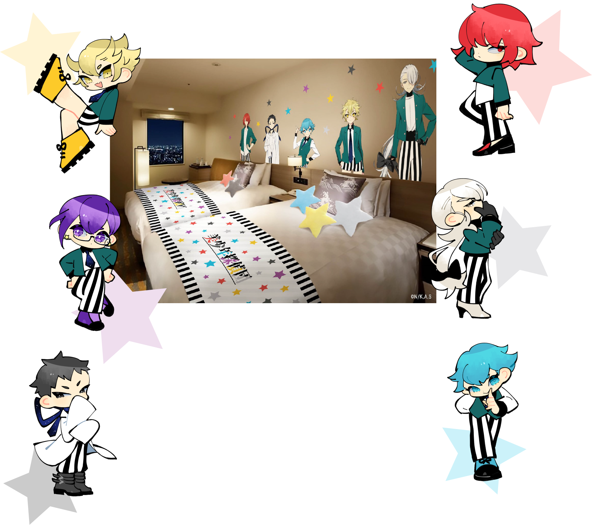 - 室内はアニメのキャラクター等で装飾されており、通常のお部屋とは全く異なるデザインになっております。