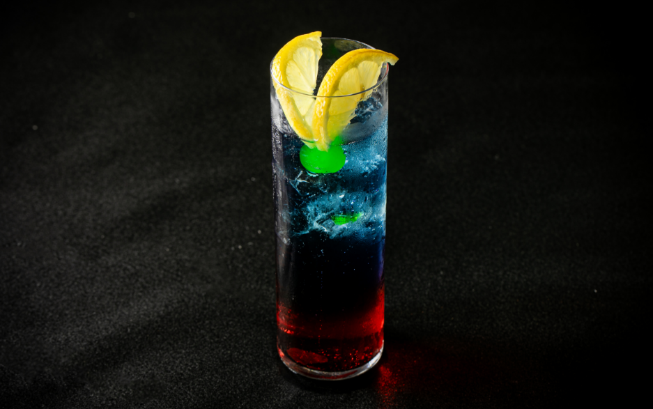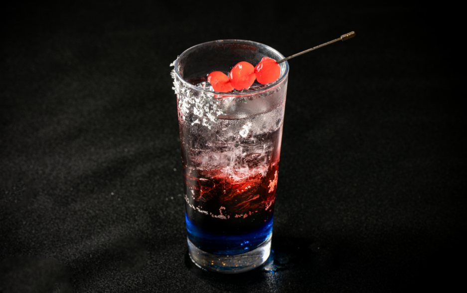 シルバーカラーをベースに赤青の3層仕立てのドリンクになります。