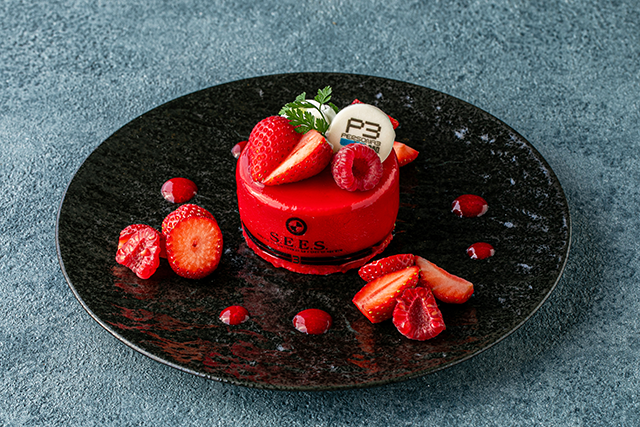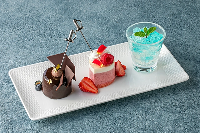 <使用材料>チョコレートケーキ/ラズベリームース/レモンジュレ/ブルーハワイジュレ ほか