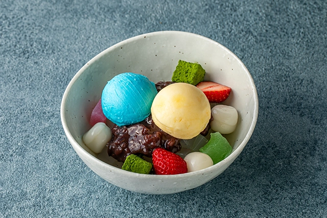 <使用材料>バニラアイス/ブルーハワイシャーベット/抹茶のわらび餅/あんこ ほか