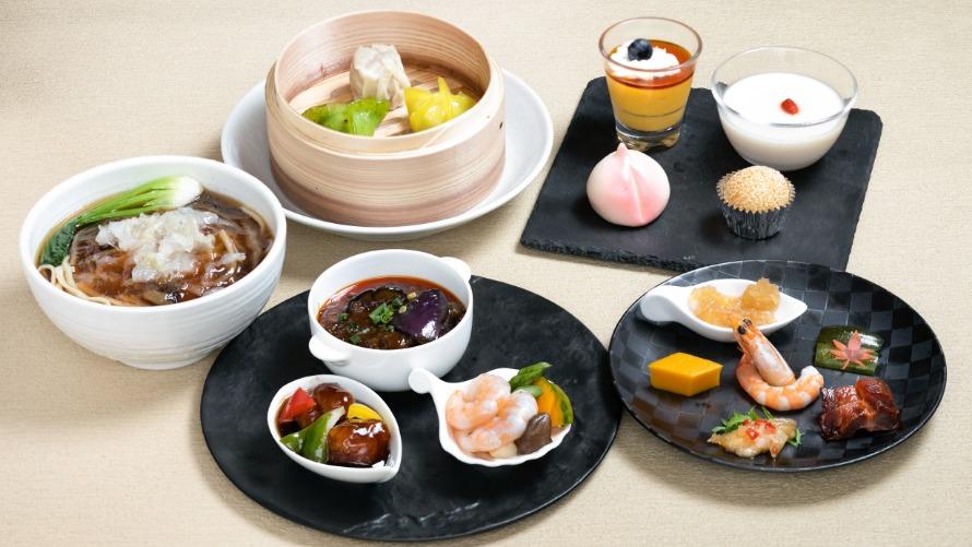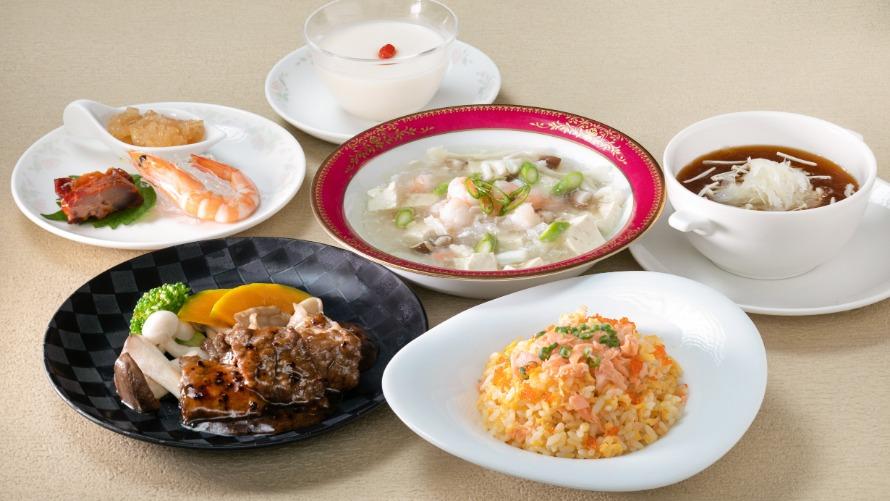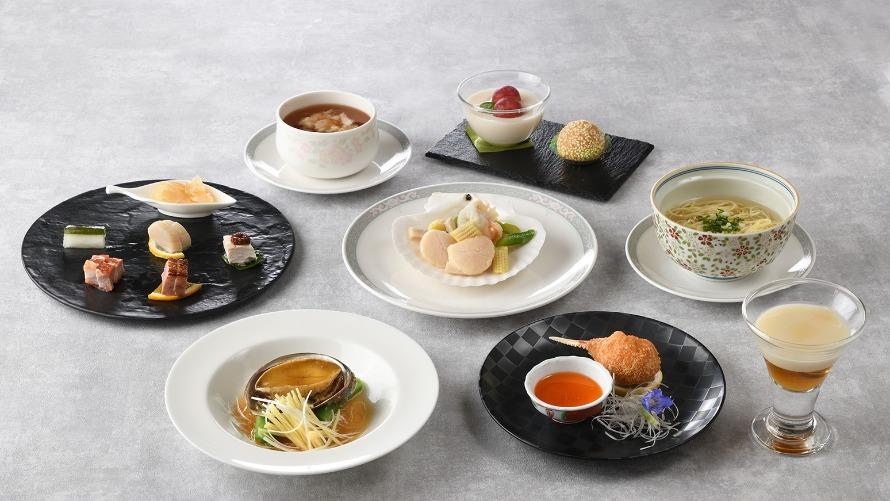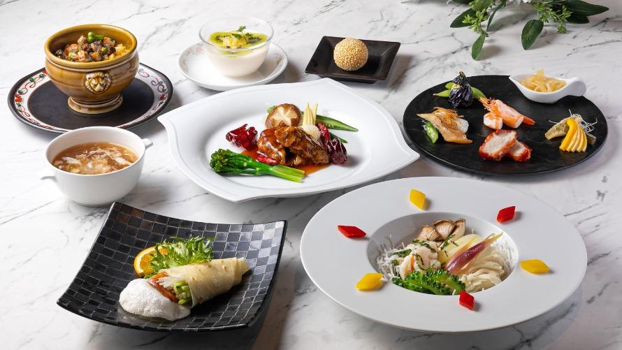 前菜や点心、人気のメイン料理3種、フカヒレを使った麺メニューにデザート4点盛りと見た目、味ともに充実した内容のセットメニューをお楽しみください。