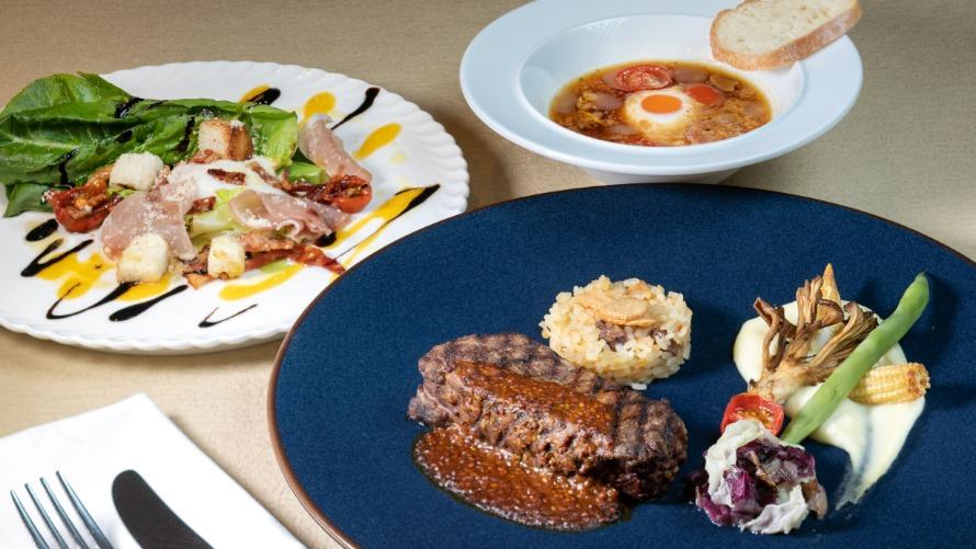 ディナーメニューでは、黒毛和牛を使ったセットメニューを中心にパスタやカレーなどのア・ラ・カルトメニューをご用意。他にも、食前酒のおつまみとして、メイン料理にもう一品としてご用意する、ア・ラ・カルトメニューもおすすめです。