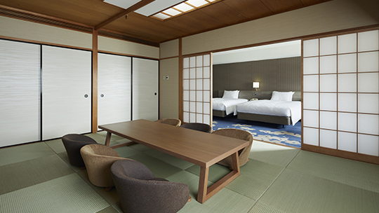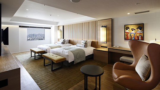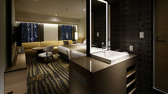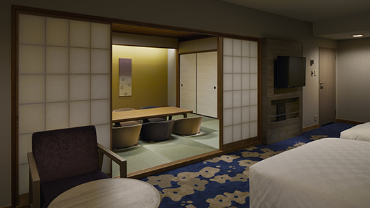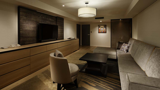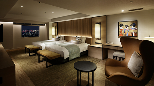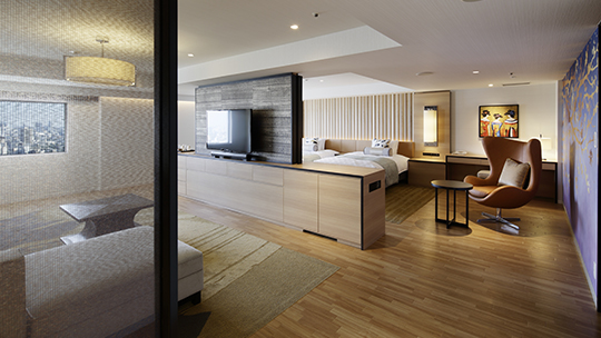 現代的な東京の街並みと伝統の「和モダン」がコンセプトのフロアで最も広いお部屋。高層階からの眺望を目の前に、ゆったりとお過ごしいただけます。