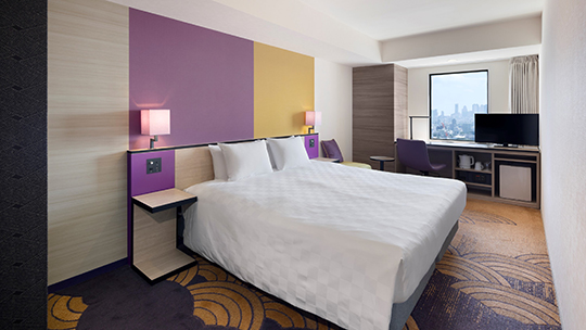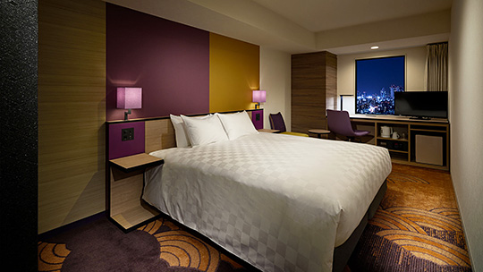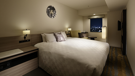 高層階からの眺望を目の前に、カップルやご友人、おひとりさまでもゆったりとご利用いただける広々としたベッドを備えたお部屋です。