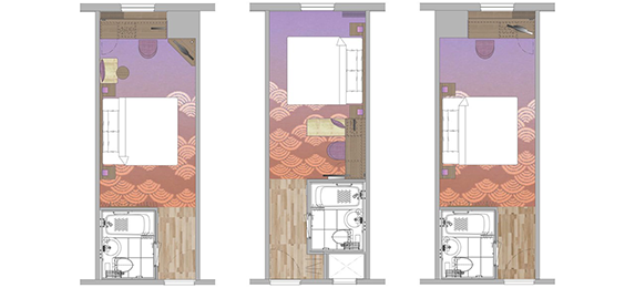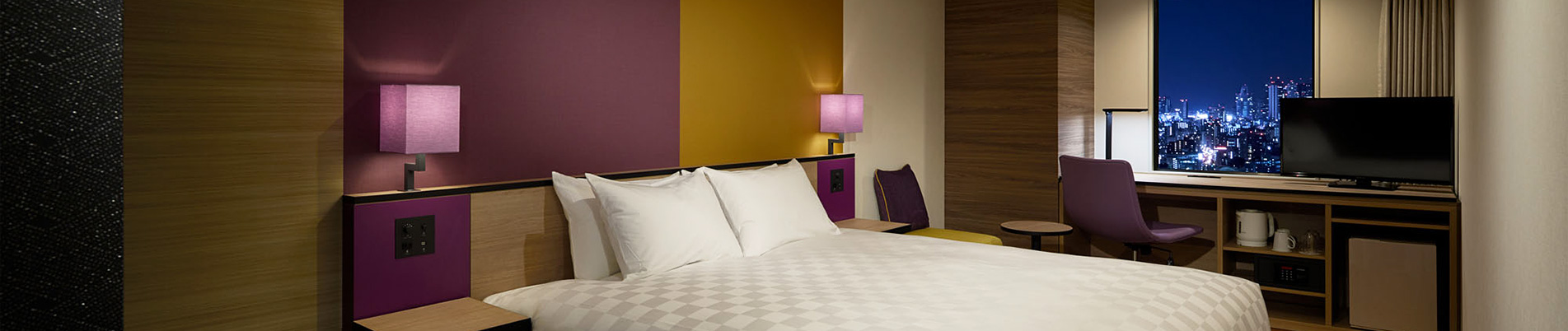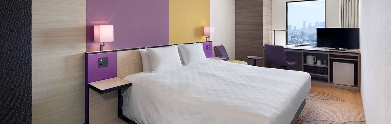 高層階からの眺望を目の前に、カップルやご友人、おひとりでもゆったりとご利用いただける広々としたベッドを備えたお部屋です。