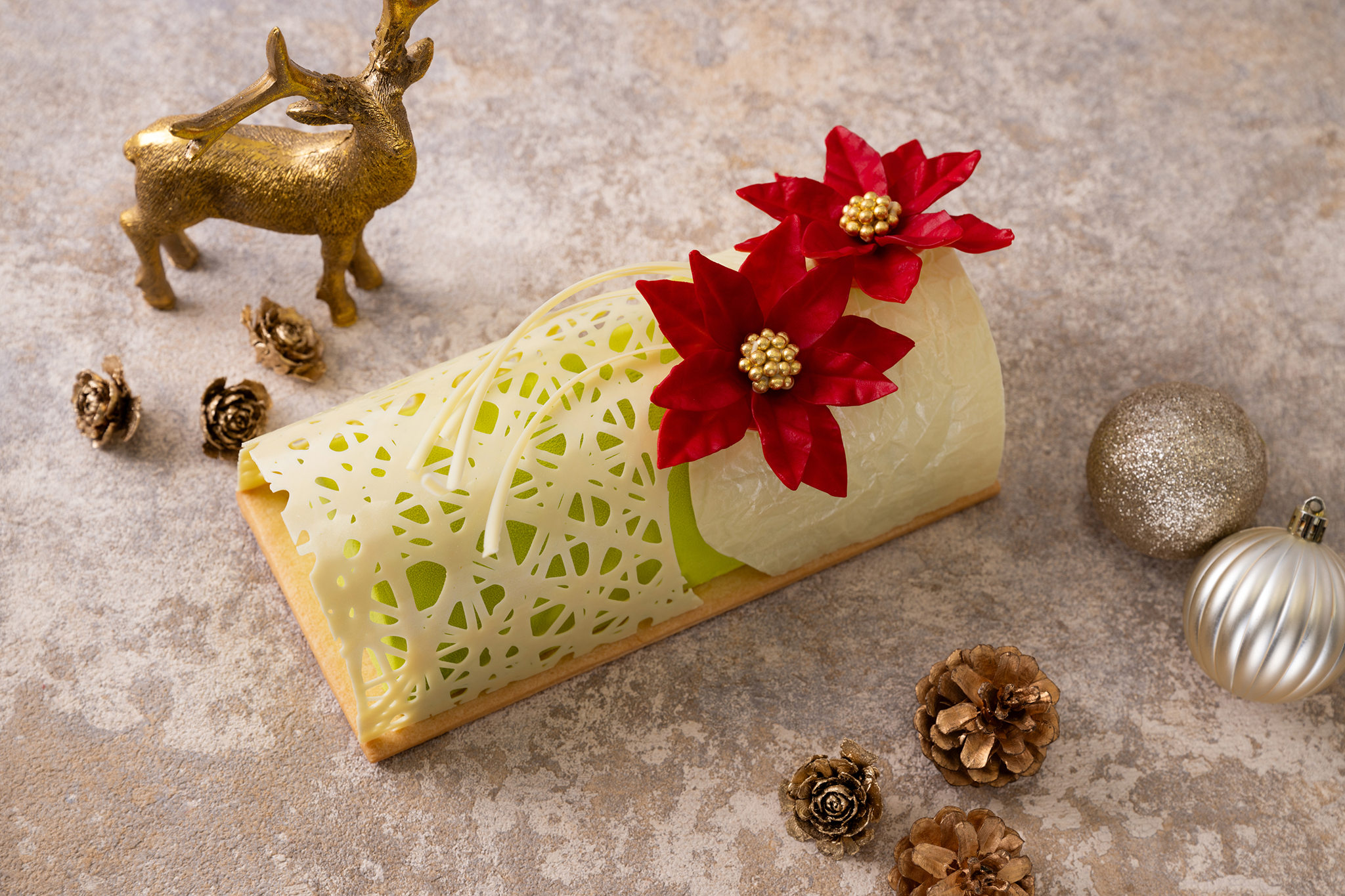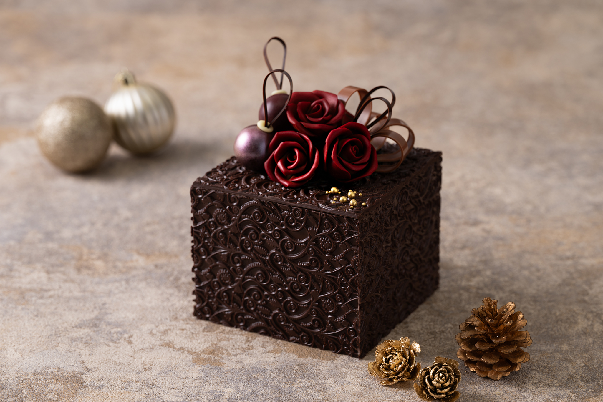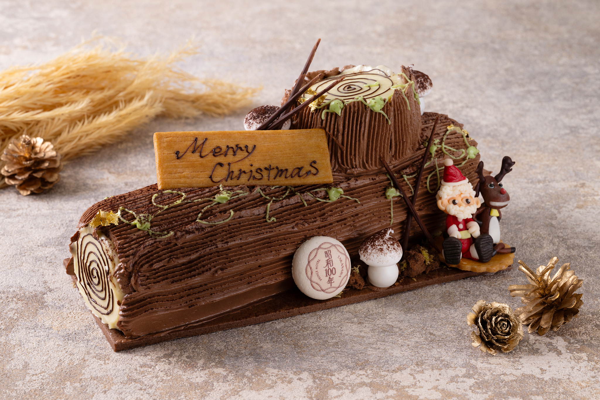 濃厚なチョコレートムースをしっとりとした生地で巻き、チョコレートバタークリームでデコレーションした懐かしい味わいのロールケーキ。にぎやかなクリスマスの様子をイメージしたチョコレート細工のサンタとトナカイ、メレンゲの焼き菓子を添えて。昭和元年から100年にあたる節目を祝い、時代を超えて、心温まるひとときをお届けいたします。
