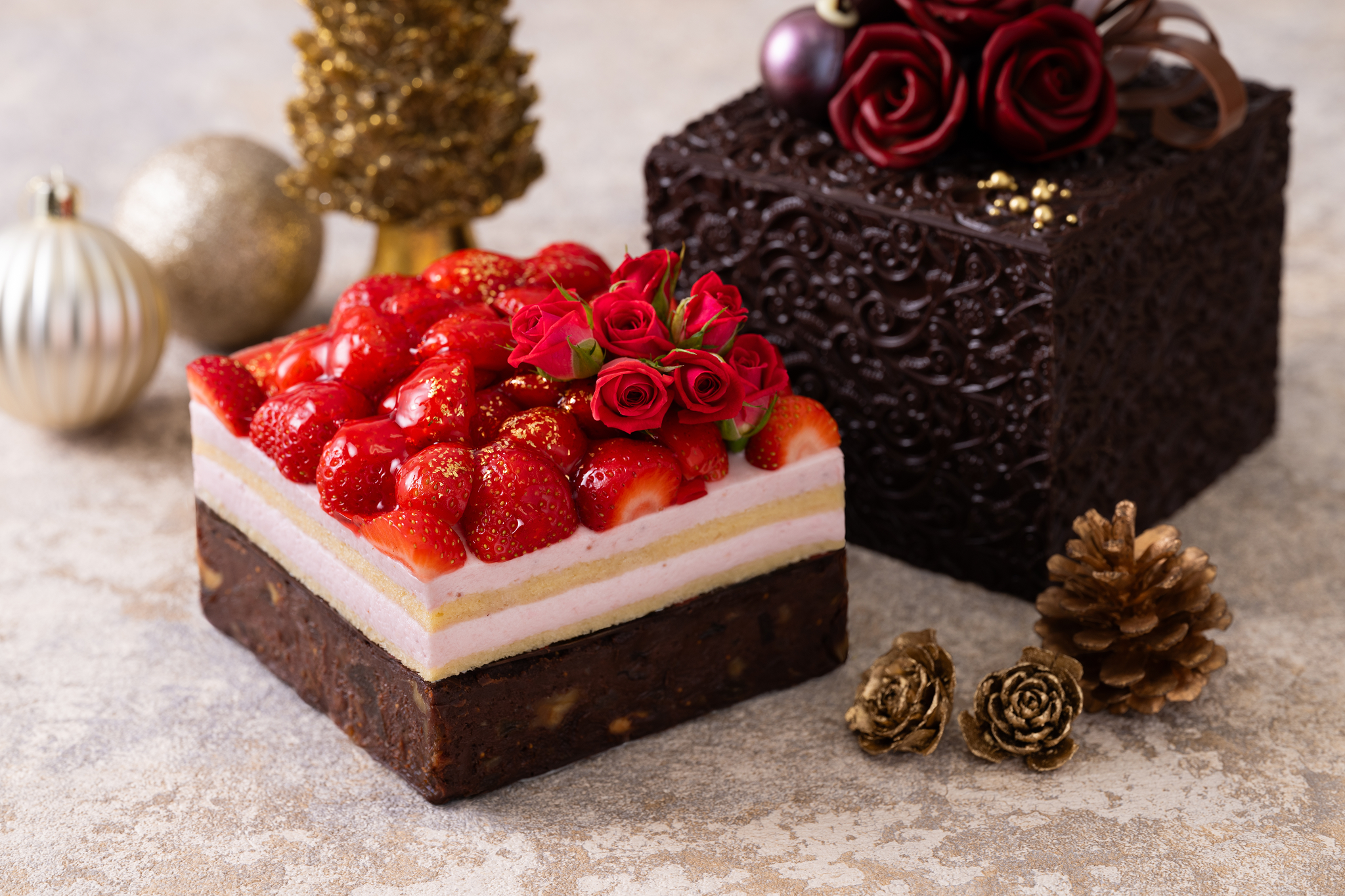 フランス語で「かわいい贈り物」を意味する、サプライズにおすすめの華やかなケーキ。オーナメントやバラもすべてチョコレートでできたプレゼントボックスの中に、たっぷりの輝く苺「あまおう」をのせたベリームース、アプリコット・いちじく・オレンジピール・レーズンなどのラム酒漬けやくるみを入れたガトーショコラの2層が贅沢に重なります。