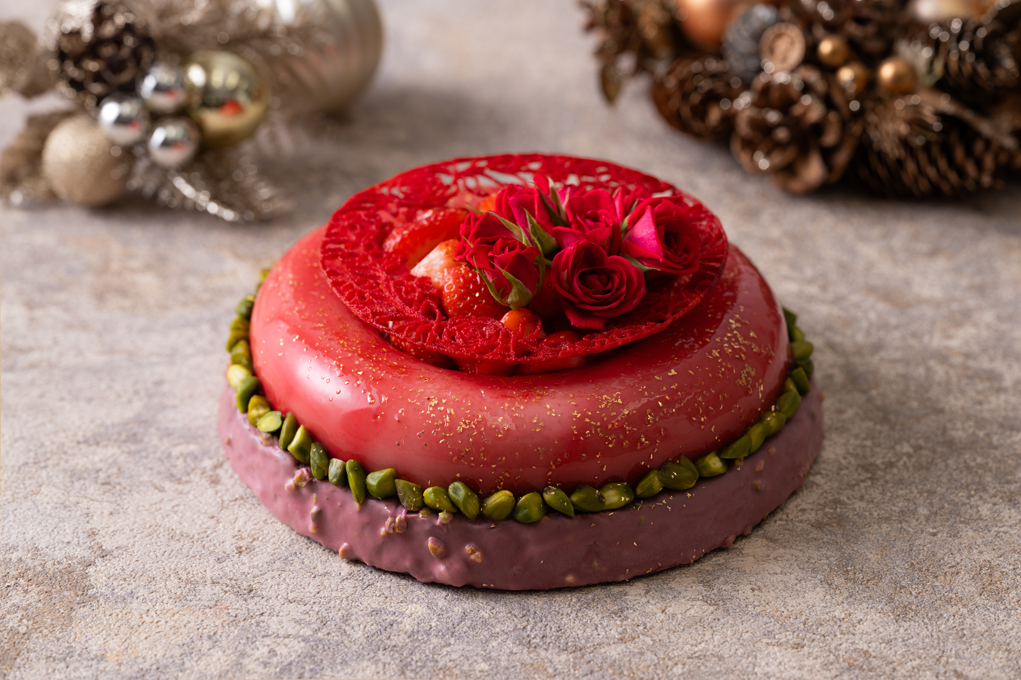 洗練された真っ赤なバラのデザインが特徴のムースケーキ。