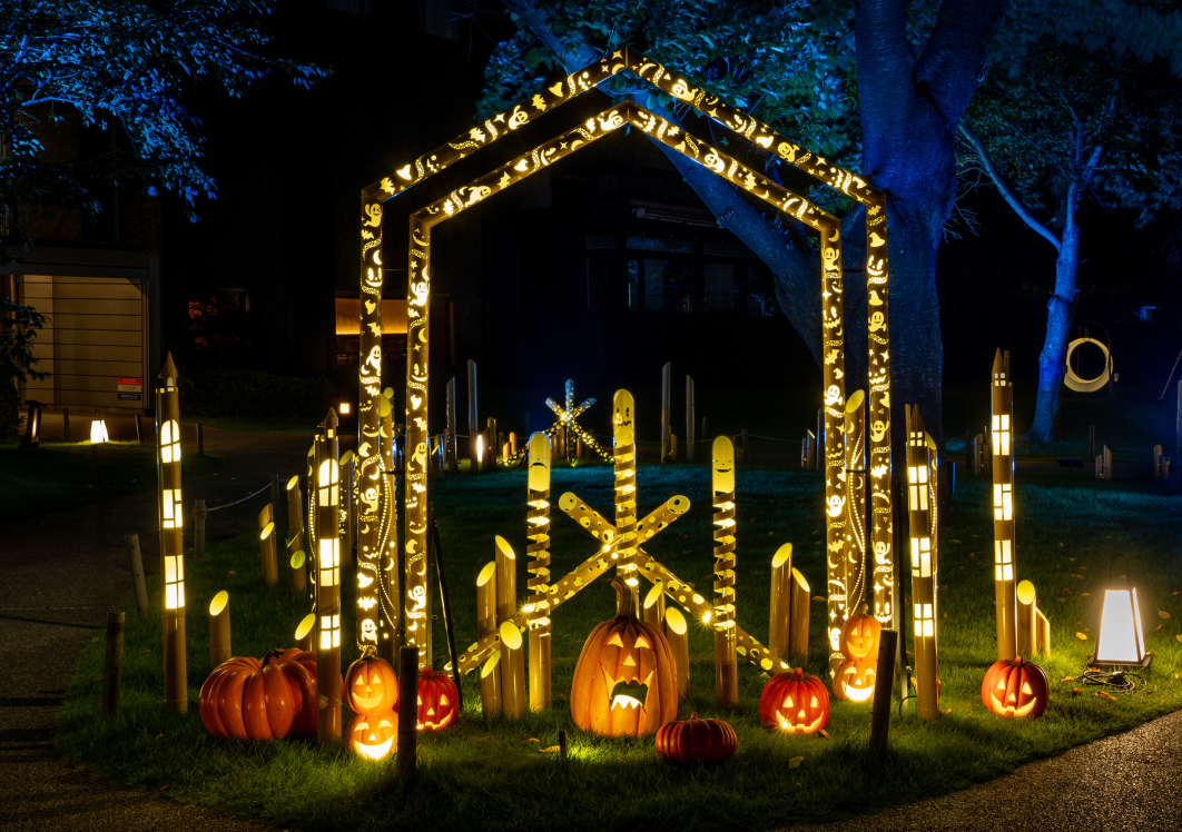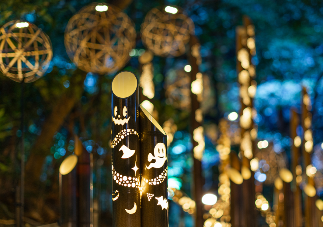 日本庭園の各所にハロウィーン竹あかりが登場! おばけたちがいたずらしようと隠れているので、見つけられたら記念にお写真を♪