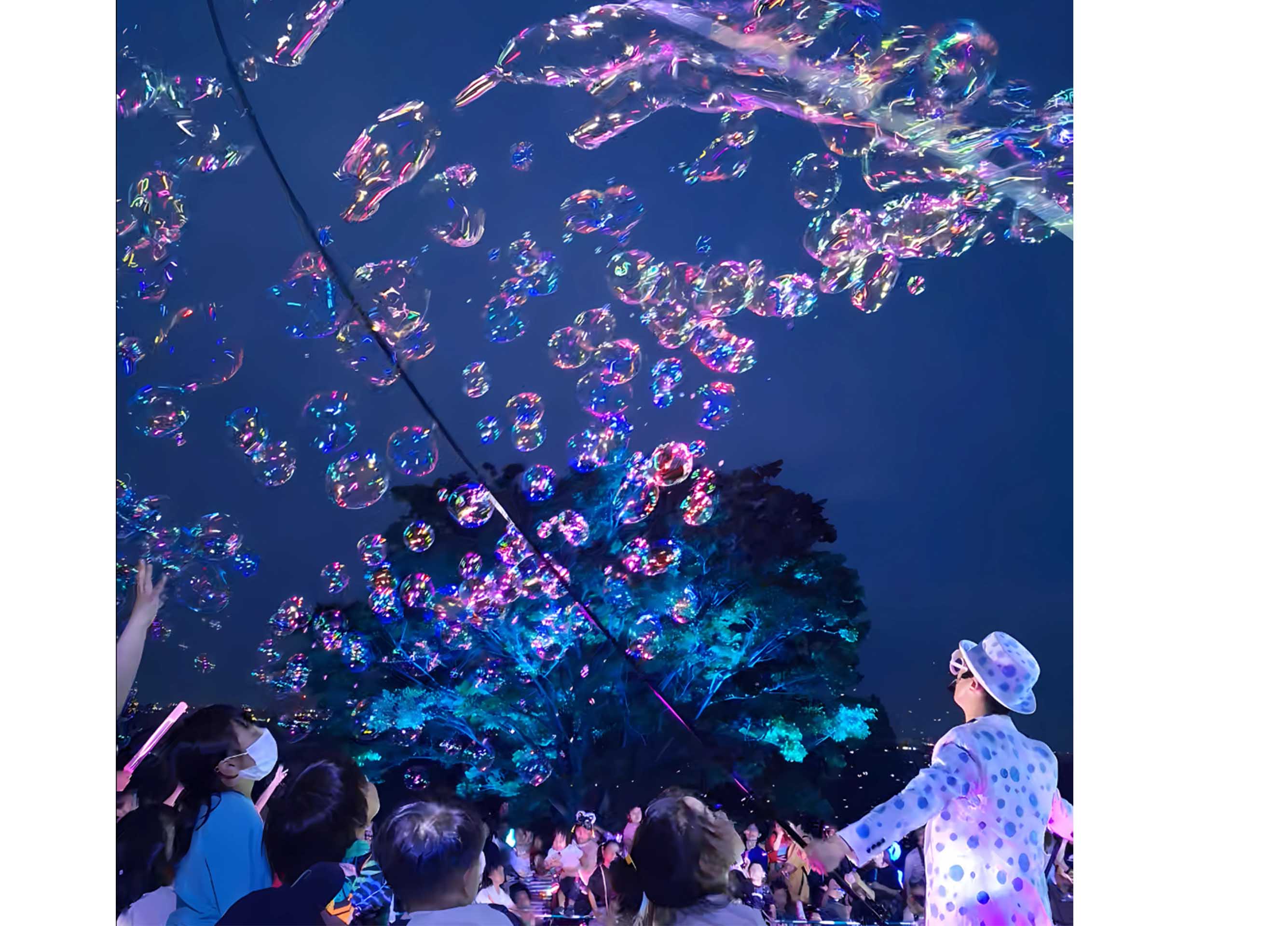 年間100ステージ以上!プロのシャボン玉パフォーマーバブリン先生がお届けする夜空にライトアップされた幻想的なシャボン玉ショーです。巨大なシャボン玉、大量のシャボン玉、様々なシャボン玉が夜空を彩ります。