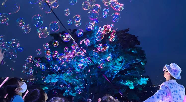 夜空をキャンバスに、泡で描く魔法のショー。キラキラと煌めく幻想的なナイトバブルショーをお楽しみください。