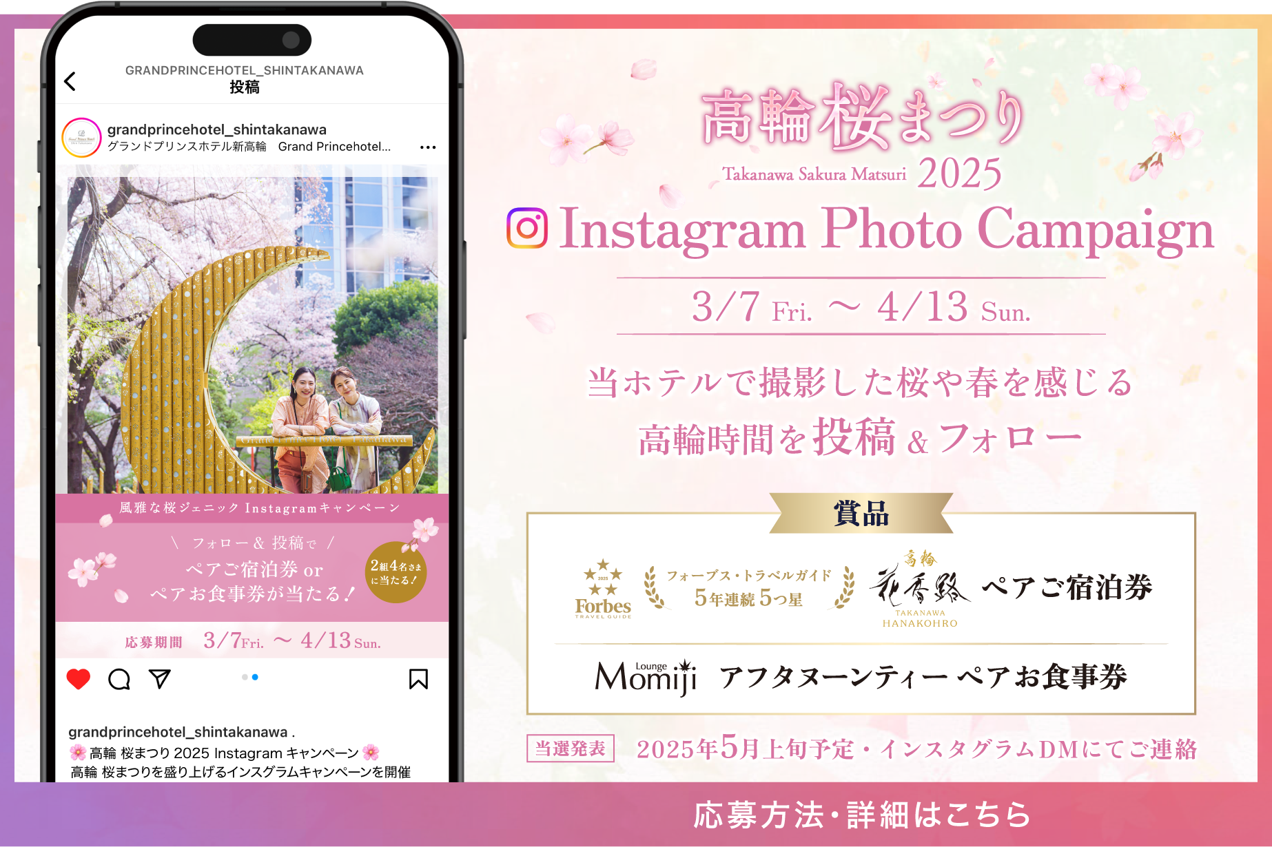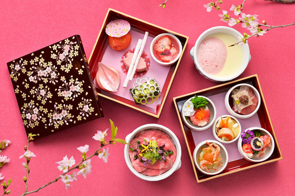 - 国内外で数々の賞を受賞したフレンチシェフ、パティシエがおくる、桜の季節限定の小箱。キャビアやオマール海老、和牛などを使用した華やかなメニューをご堪能いただけます。日本庭園の桜景色、夜には竹あかりの幻想的な風景とともに風雅な高輪の粋を感じるお花見をお愉しみください。