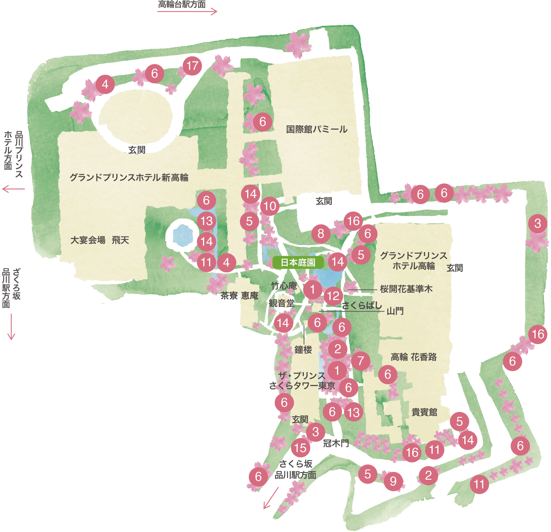 高輪エリア3つのホテルに囲まれたおよそ2万平方メートルの日本庭園では、17種 約210本もの桜が春に満開を迎えます。