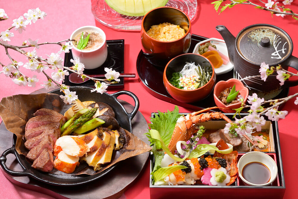 - 桟敷のお席にて味わう、神戸ビーフ尽くしの春限定コース。伊勢海老や鮑、タラバガニ、キャビアなどの高級食材を使用。桜天井の下、夜には風情あるライトアップに酔いしれて、お花見をお愉しみいただけます。