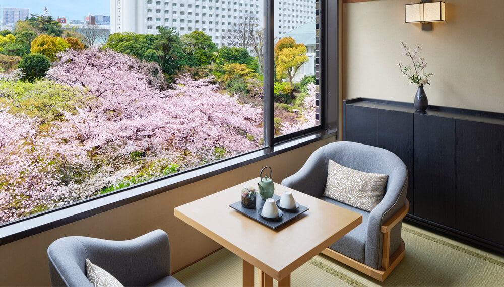 プライベートな空間で、この時期だけの桜景色を満喫。お部屋の窓いっぱいに広がる桜をお楽しみいただけます。都心とは思えないほどの自然に包まれ、日本庭園に咲き誇るさくらを眺めながら、春の訪れを感じる特別なひとときをお過ごしください。
