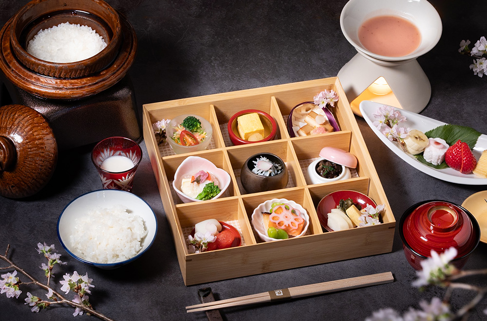 手に届きそうなほどの桜を前に心と身体が整う和朝食をご堪能ください。 -