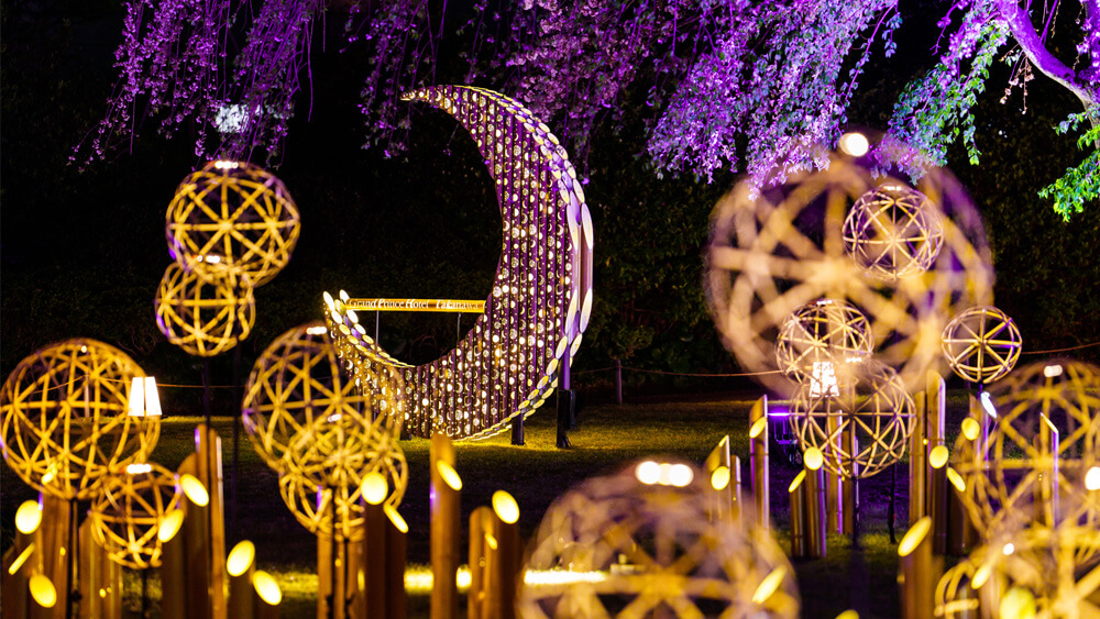 江戸時代の月待ち文化「高輪廿六夜(たかなわにじゅうろくや)」を竹あかりで表現。桜の花びらをイメージした優しい煌めきが夜の桜を包み込みます。