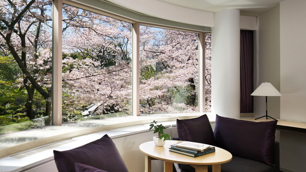和の設えとモダンを感じるお部屋でごゆっくりと安らぎのひとときを。窓一面に広がる、日本庭園の桜が彩る春の装いをご堪能いただけます。プライベートなお花見時間はお泊まりいただいた方だけの特別なもの。都心にありながらも自然が広がる日本庭園の景色とともに、高輪の春をお楽しみください。