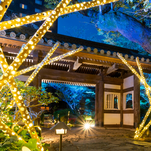 - 庭園内には、港区有形文化財に指定されている歴史的建造物が点在しています。その周辺には、それらと調和する黒竹を使用した竹あかりがあしらわれています。
