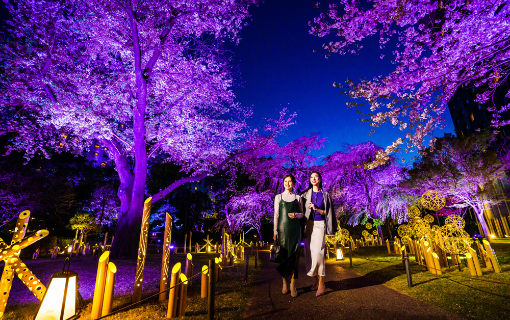 桜の竹あかり - 桜の花びらをイメージした優しいきらめきが日本庭園を包み込みます。この季節だけの特別な景色をごゆっくりお楽しみください。